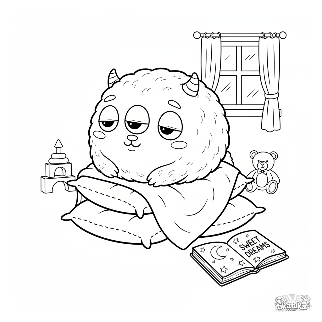 Coloring page for kids: a friendly, fluffy three-eyed monster napping on a pillow fort. Cute cartoon style, for ages 4-6.