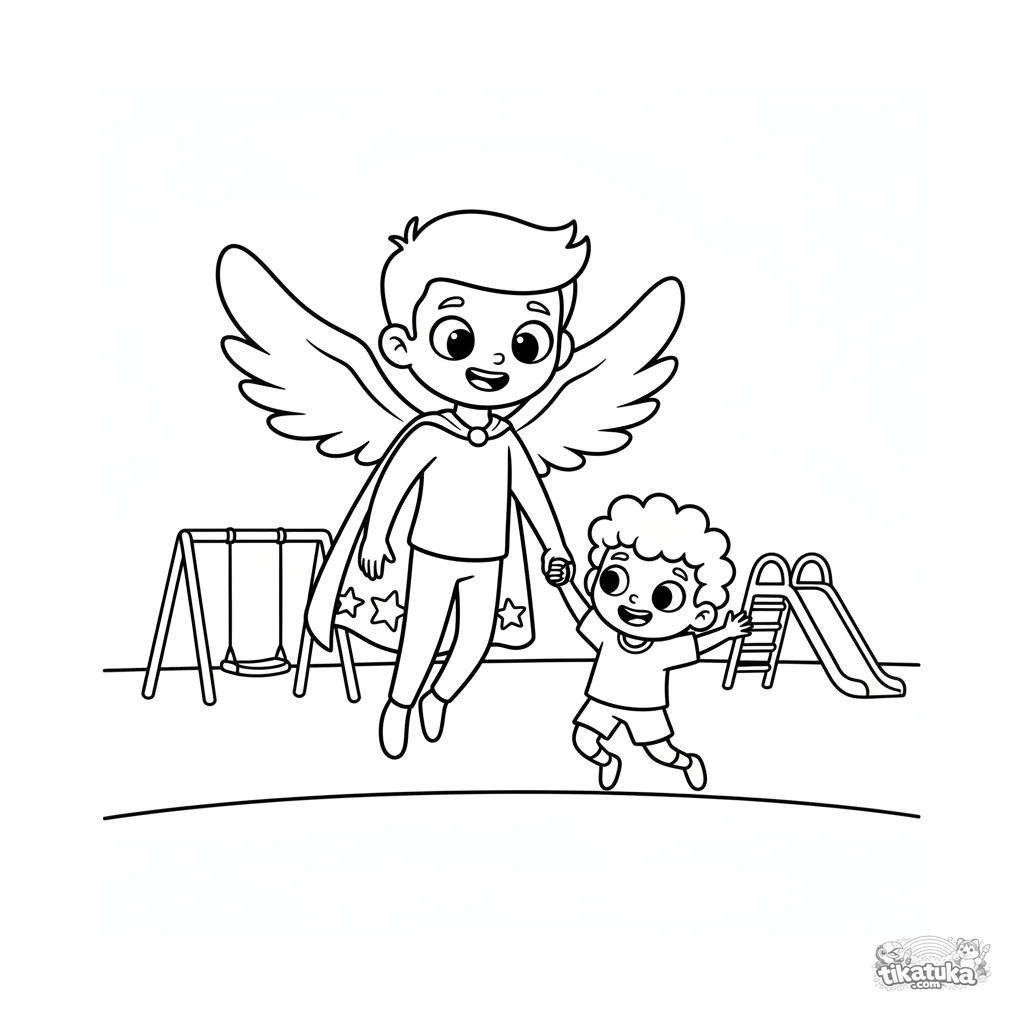 Simple coloring page for toddlers 2-3: a flying hero with wings helps a child jump on a school playground.