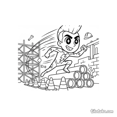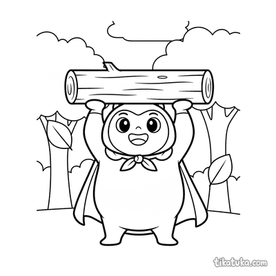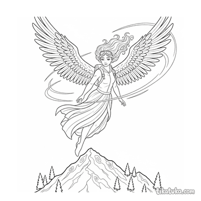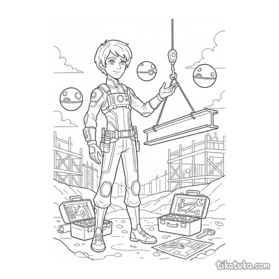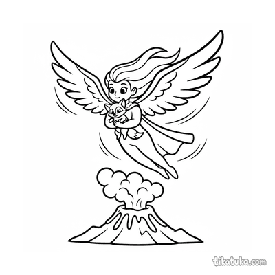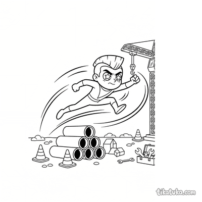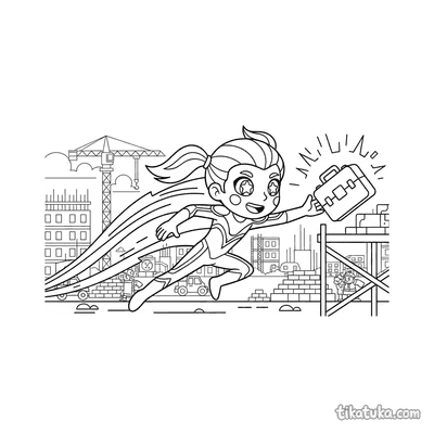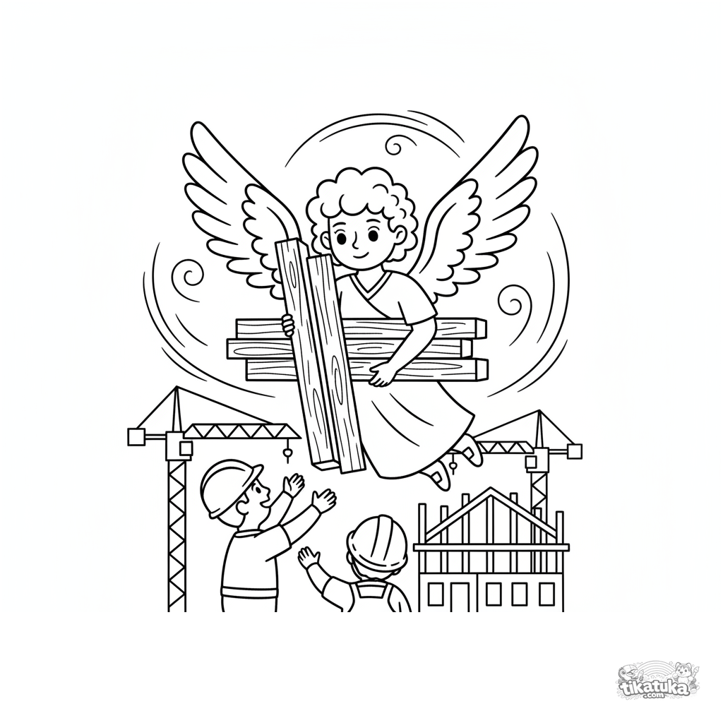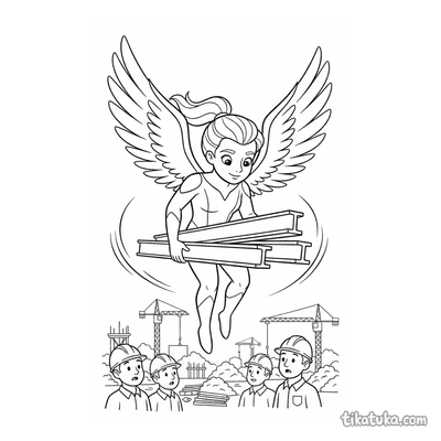Simple coloring page for toddlers 2-3: a kind flying hero with large wings helps at a construction site, carrying beams. Large, clear shapes for easy coloring.