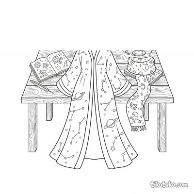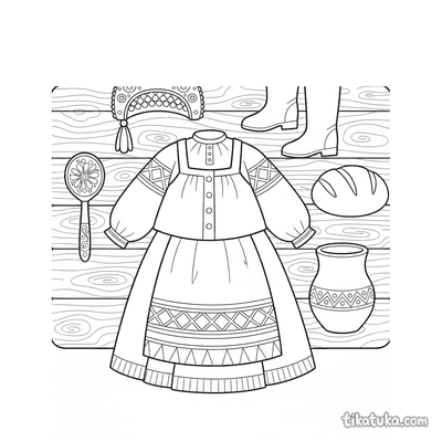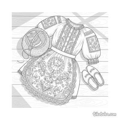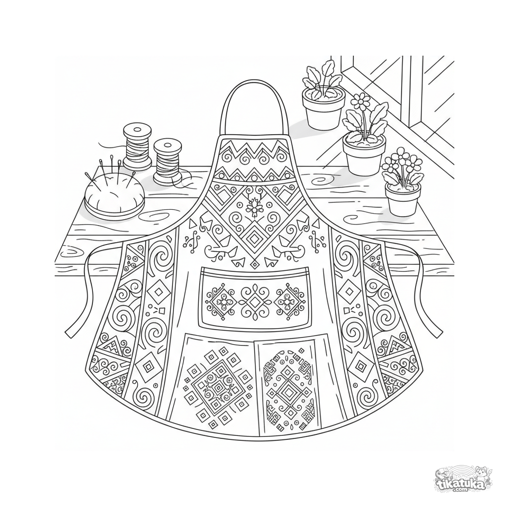 Complex coloring page: a folk embroidery apron in a flat lay on a designer's desk. For ages 10-12, intricate patterns and interior details. Free printable.