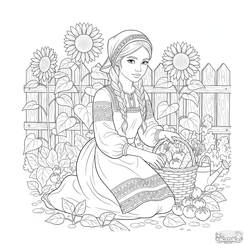Detailed coloring page for ages 10-12: a girl in a folk embroidery apron dress harvesting vegetables in a garden. Intricate geometric patterns and a naturalistic background.