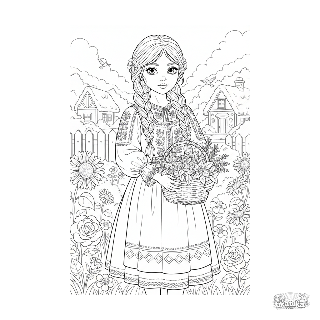 Coloring page for girls 10-12: a girl in a detailed folk costume with intricate embroidery stands in a cottage garden holding a basket of herbs, rich in cultural details.