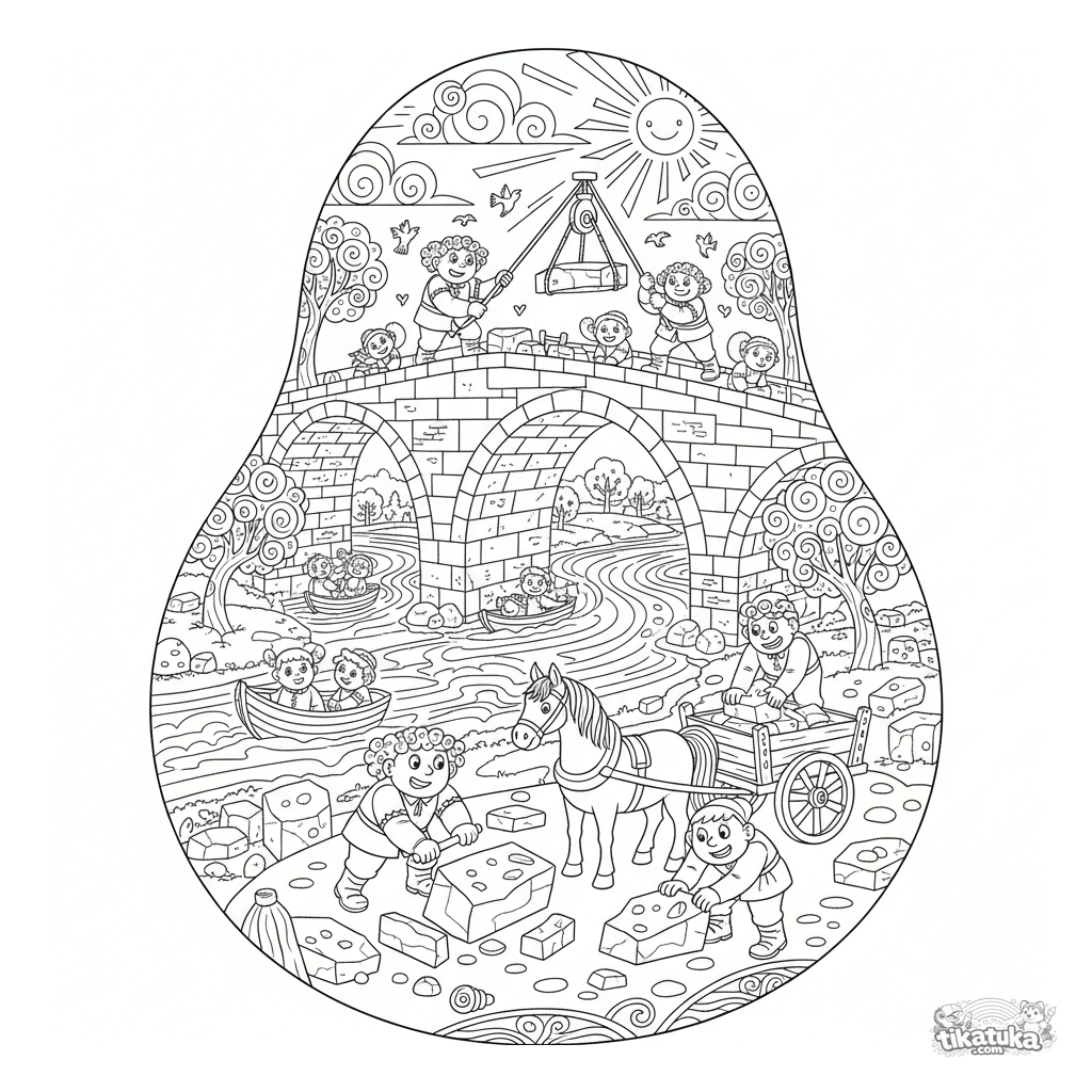 Dynamic folk art coloring page of workers building a large stone bridge. For older kids 7-12 years old. Features construction workers, pulleys, horses, and boats on the river.