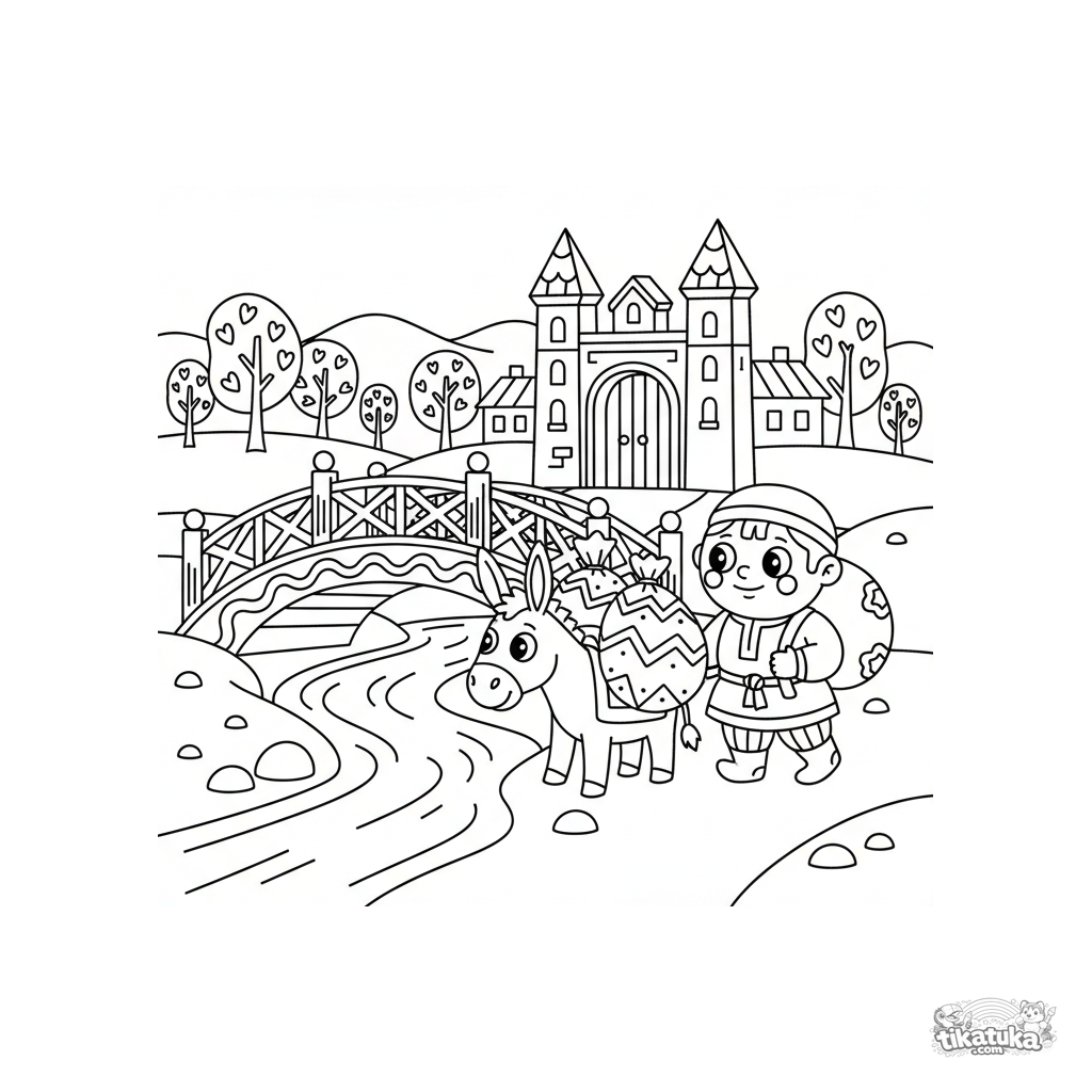 Coloring page for kids 4-6: a wooden bridge over a stream, a merchant with a donkey arriving at a village. Simple shapes, clear lines, wide margins for coloring.