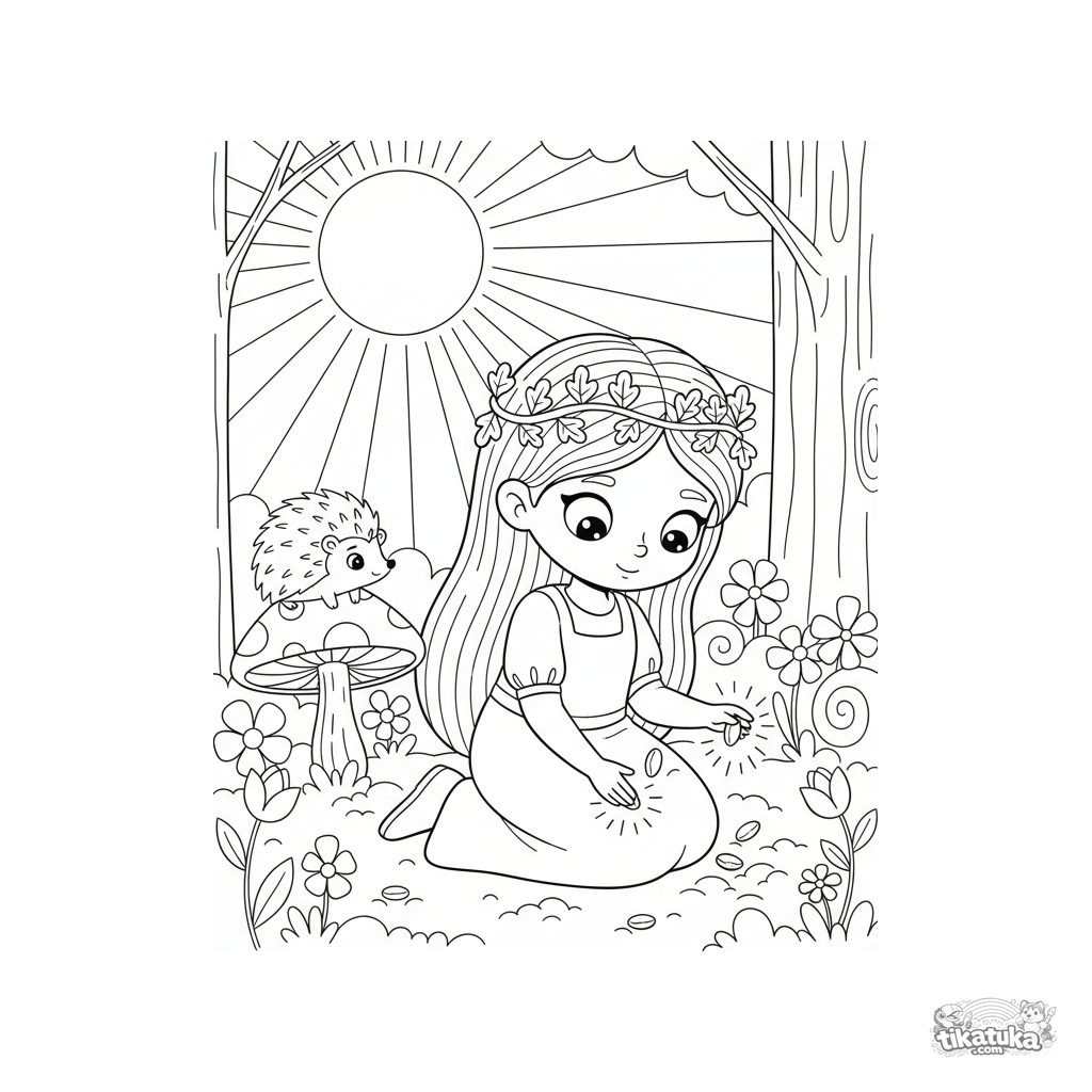 Coloring page for kids 4-6: a forest princess planting glowing seeds in a moonlit garden. A cute hedgehog watches her. Simple clear outlines.