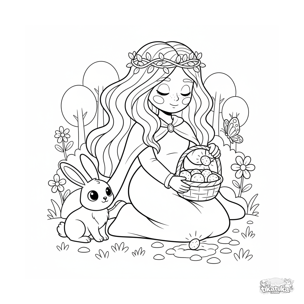 Coloring page for kids 4-6: a forest princess planting magic seeds in a meadow with a rabbit and butterfly. A calm and kind scene.