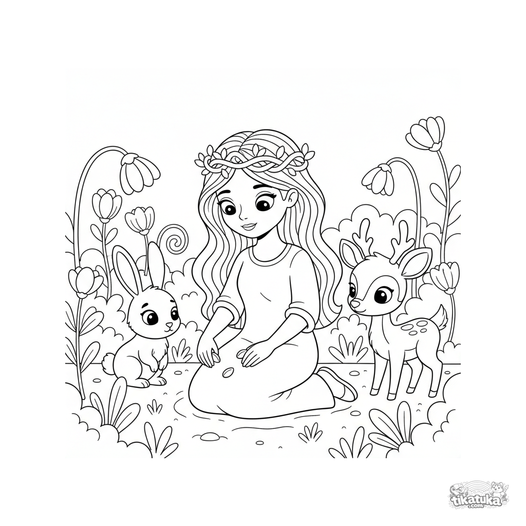 Coloring page for kids 4-6: a forest princess planting magic seeds in an enchanted garden, with a rabbit and fawn nearby.