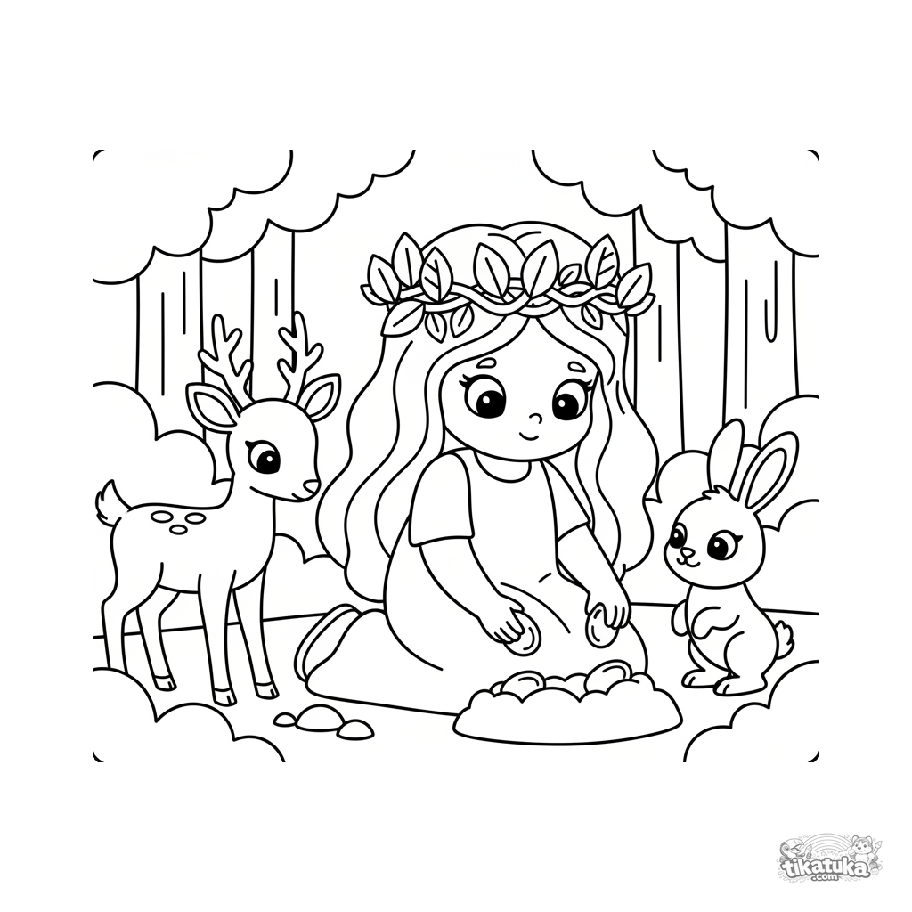 Simple coloring page for toddlers 2-3: a forest princess with a vine crown plants magic seeds in an enchanted grove, helped by a rabbit and a deer.