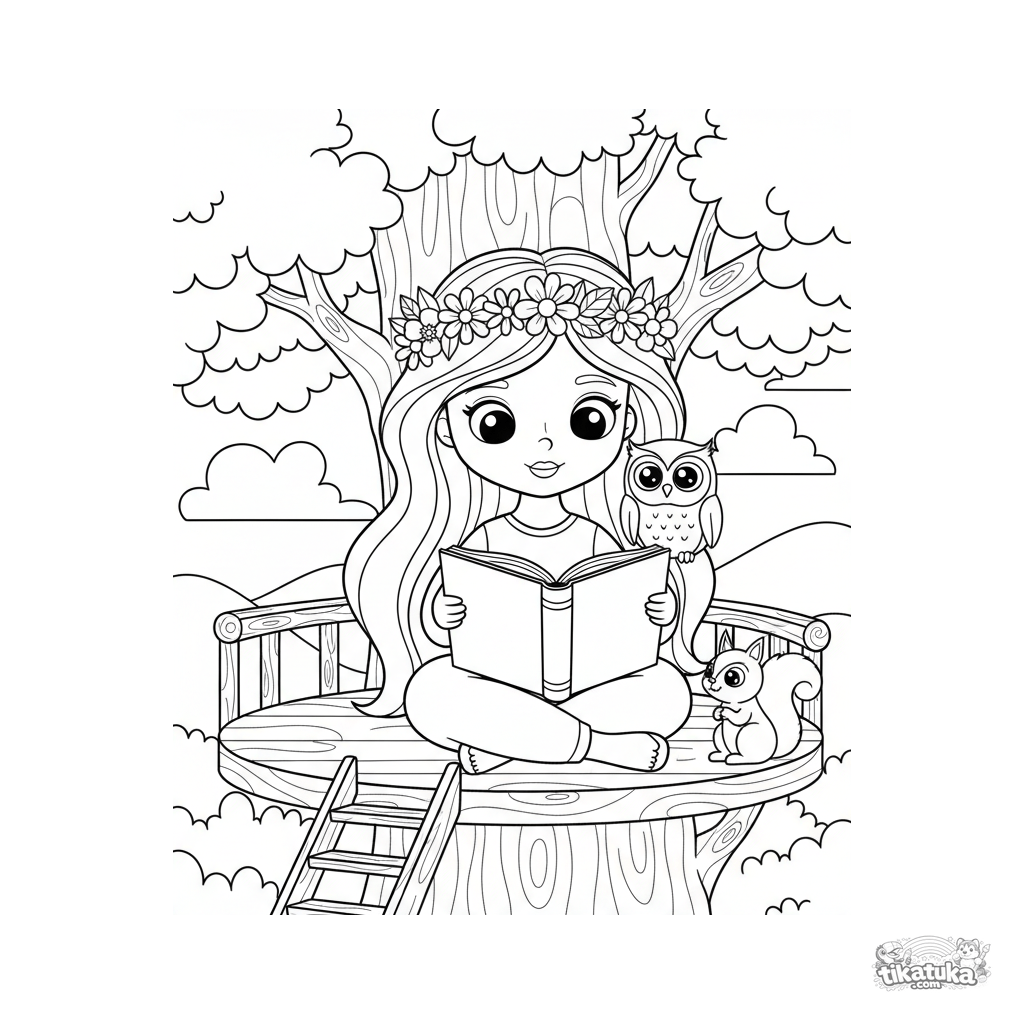 Coloring page for ages 7-9: a forest princess with a flower crown reads a storybook to an owl and a squirrel in a cozy treehouse. A scene in an enchanted forest.