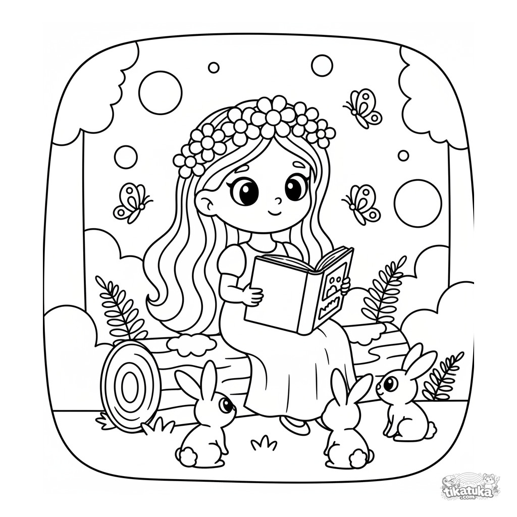 Simple coloring page for toddlers 2-3: a forest princess with a flower crown reads a book to rabbits in a glade with ferns and butterflies.