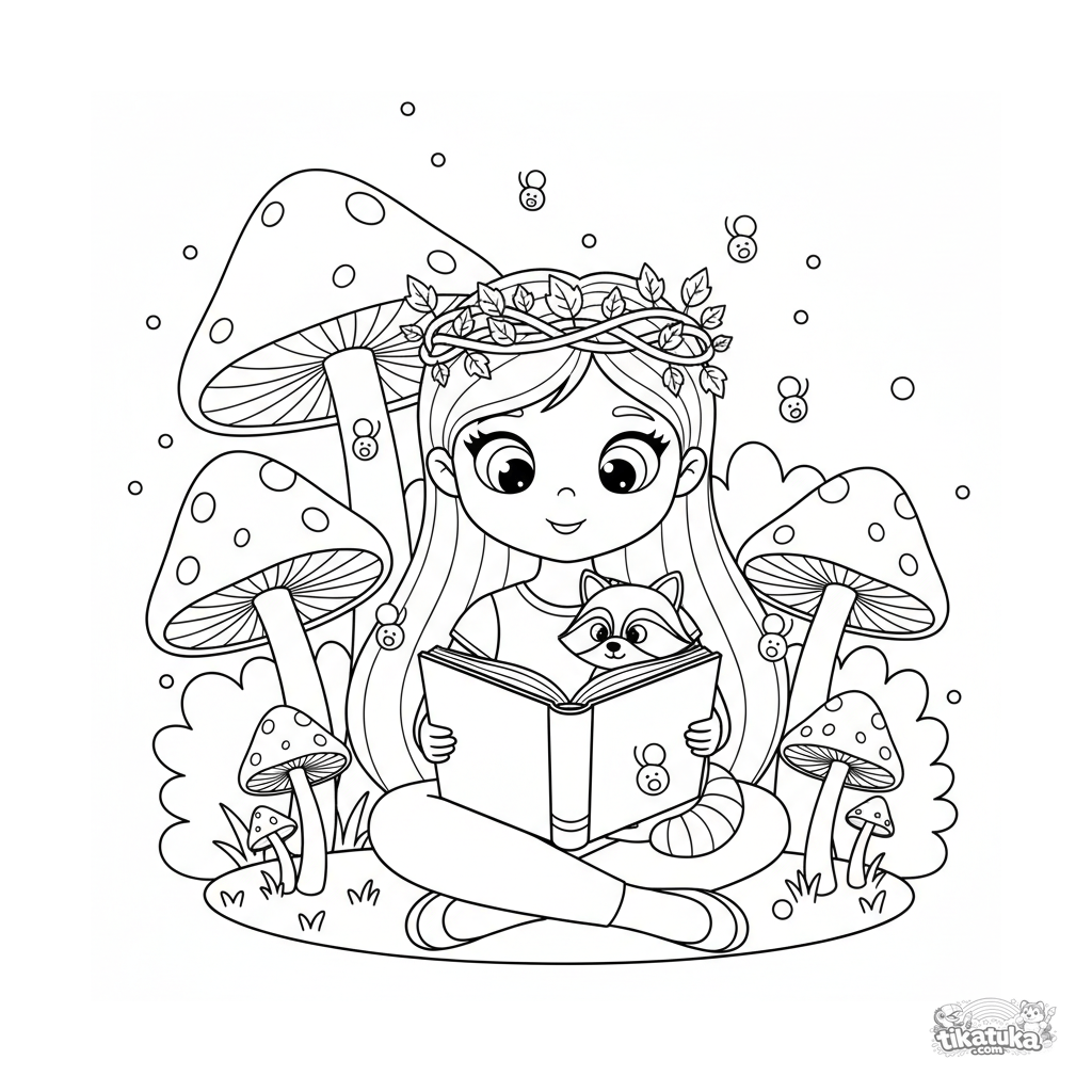 Coloring page for kids 4-6: a forest princess reads a book to a raccoon in a circle of glowing mushrooms. Leaves in her hair, drifting fireflies.