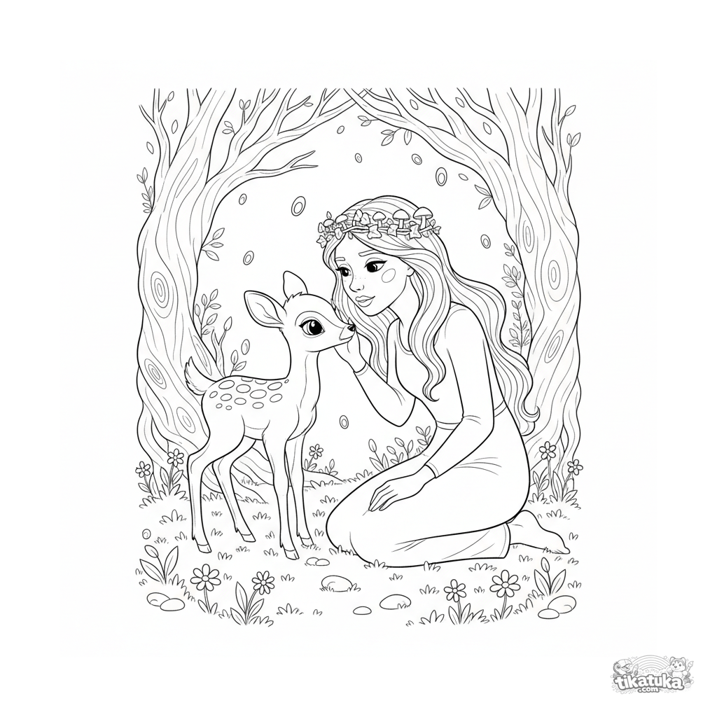 Detailed coloring page for kids 10-12: a forest princess whispering to a fawn in a moonlit enchanted grove, surrounded by fireflies and ancient trees.