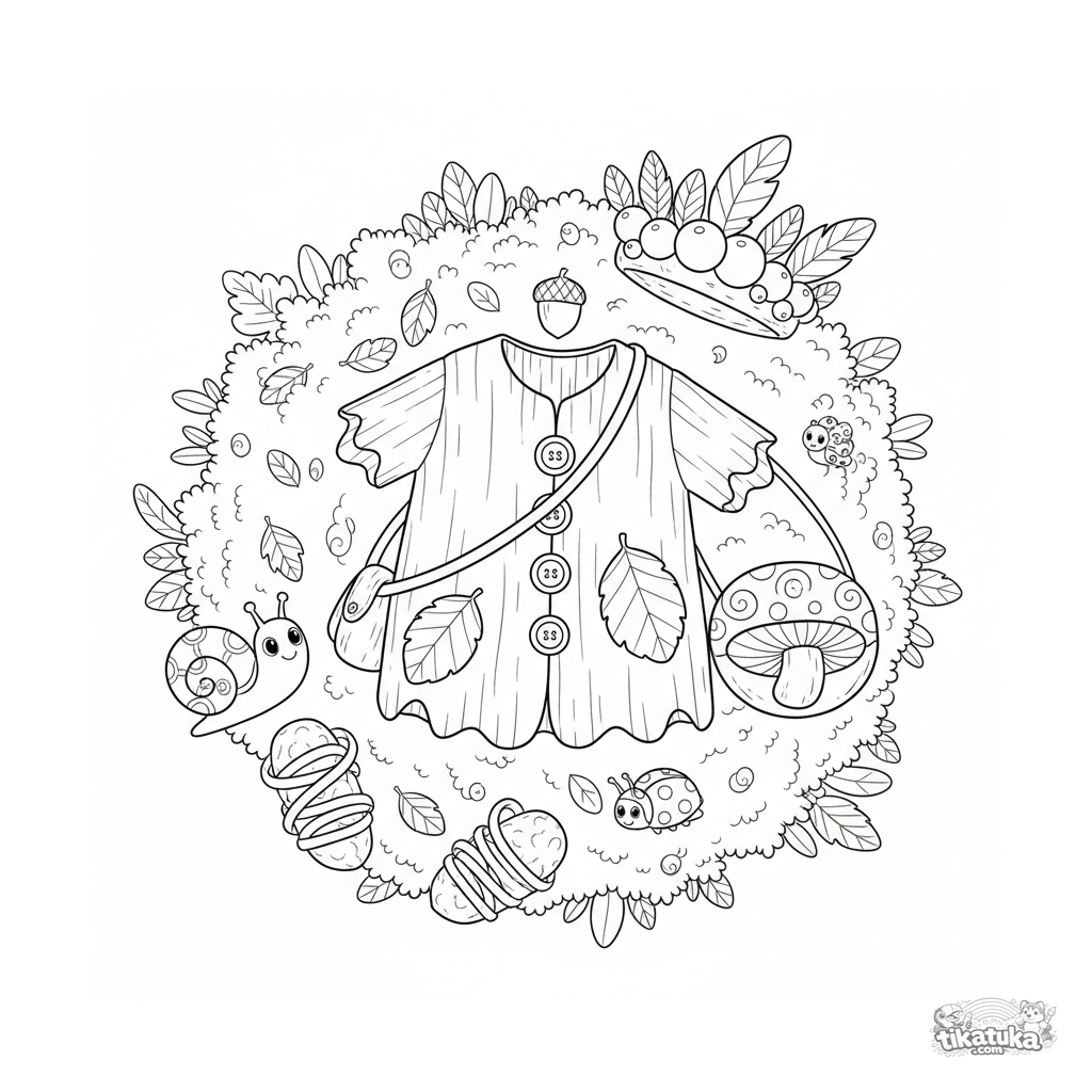Detailed coloring page for ages 10-12: a flat-lay fantasy forest sprite outfit with nature-inspired accessories arranged on moss and leaves.