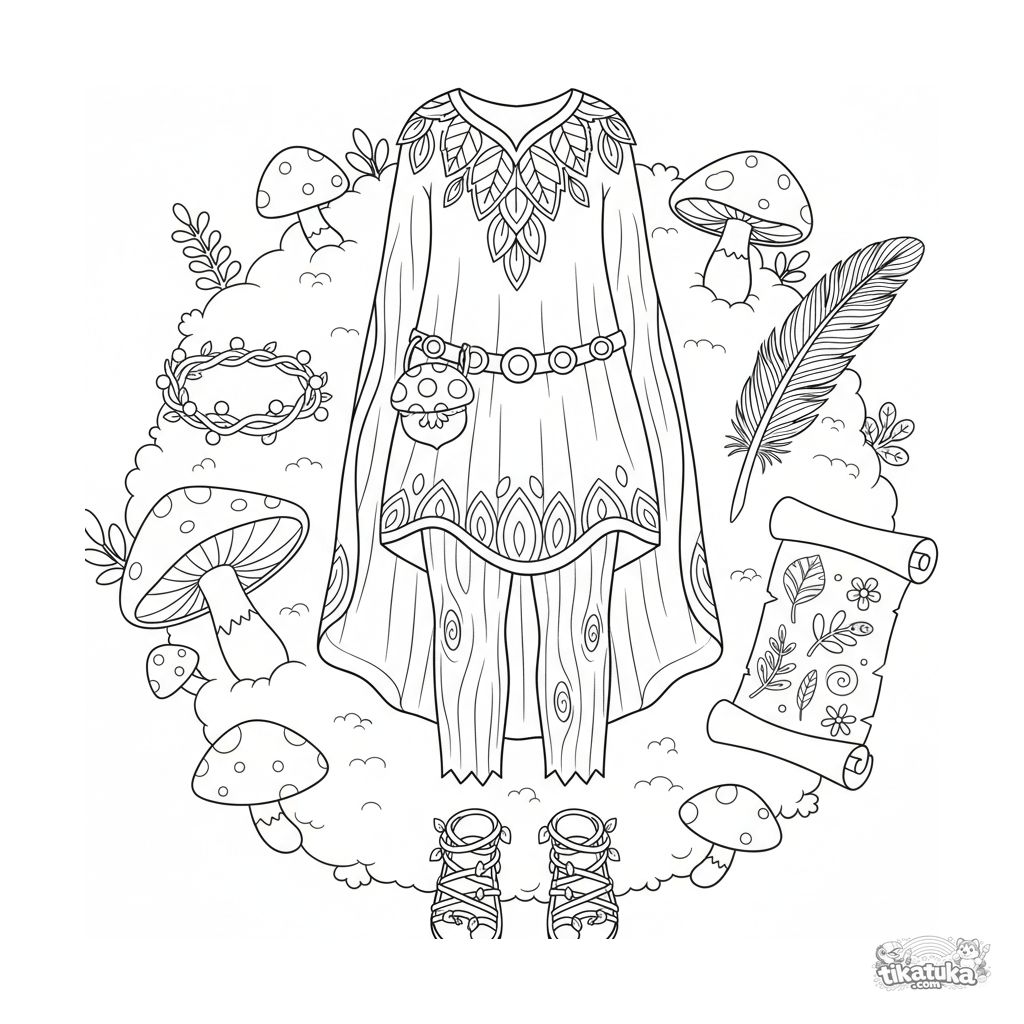 Complex coloring page for ages 10-12: a flat lay of a magical forest sprite outfit on moss, featuring a leaf tunic, vine sandals, a mushroom pouch, and a twig crown.