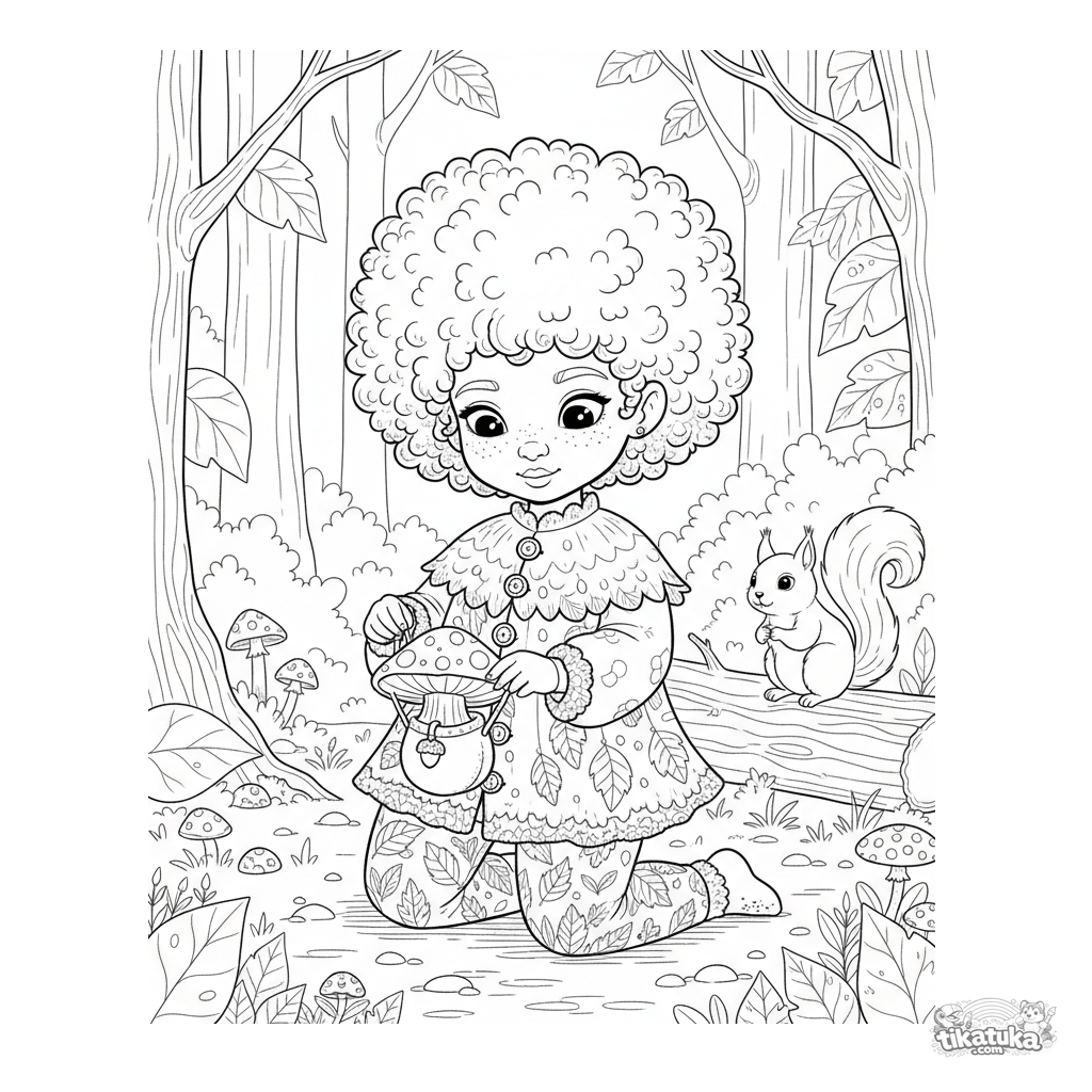 Detailed coloring page for ages 10-12: a forest sprite in a tunic and leaf outfit in a forest clearing. Realistic storybook style, many natural details.