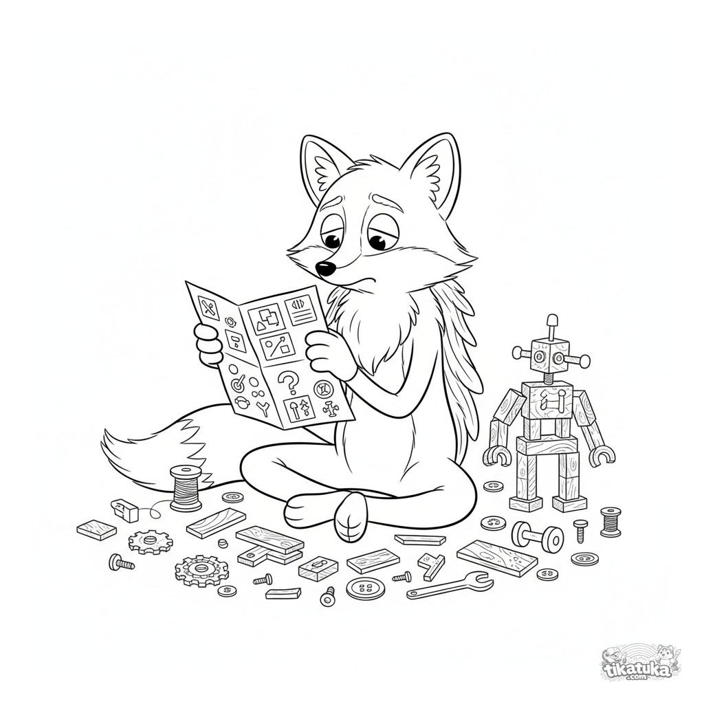 Coloring page for kids 7-12: a fox looks utterly confused at a cryptic assembly instruction sheet, sitting among scattered parts. A chaotic and funny scene.
