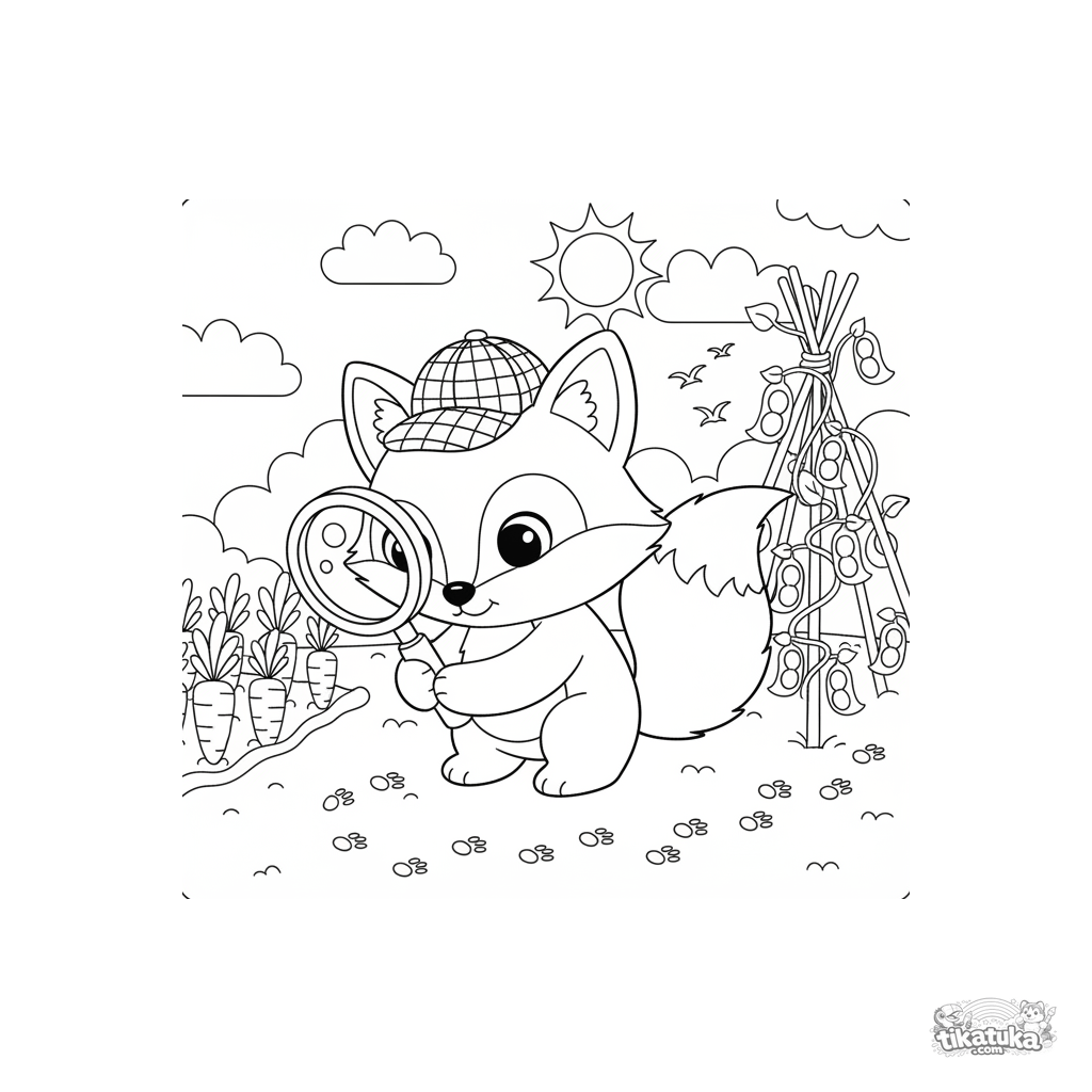 Coloring page with cute detective fox Foxy in a vegetable garden. For kids 4-6 years old. The little fox is searching for footprints among carrot rows.