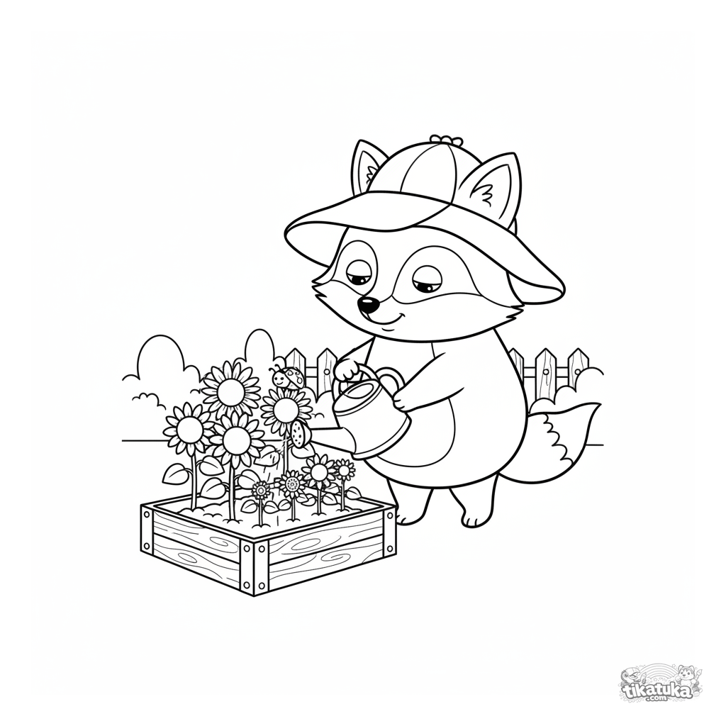 Coloring page for kids 3-7: fox Foxy in a gardener's hat waters young sunflowers in a garden bed. Calm and cute garden scene for coloring.