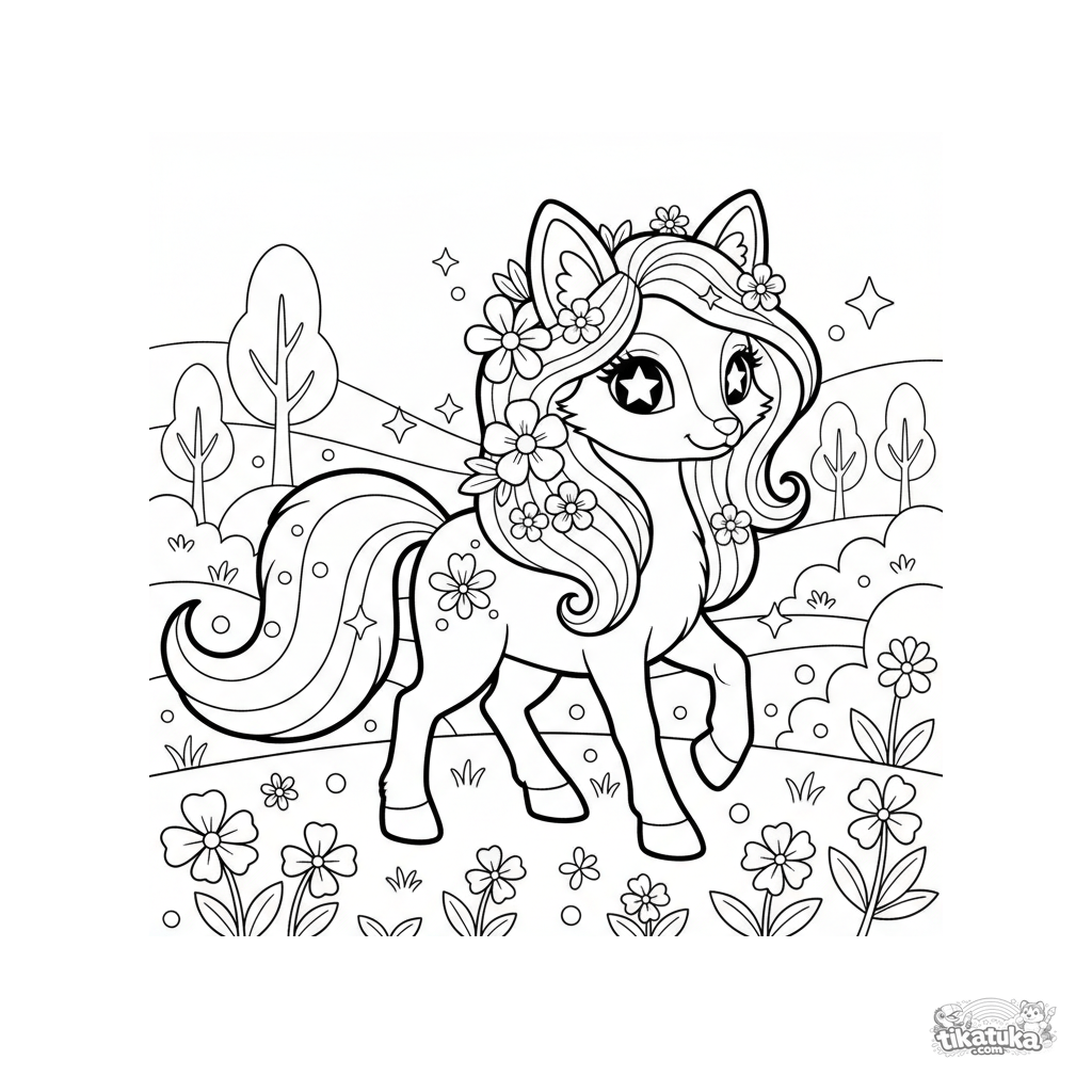 Coloring page for girls: magical pony-fox Foxy trotting through a meadow. Soft puppet style, floral mane, floating sparkles, wide margins for coloring.