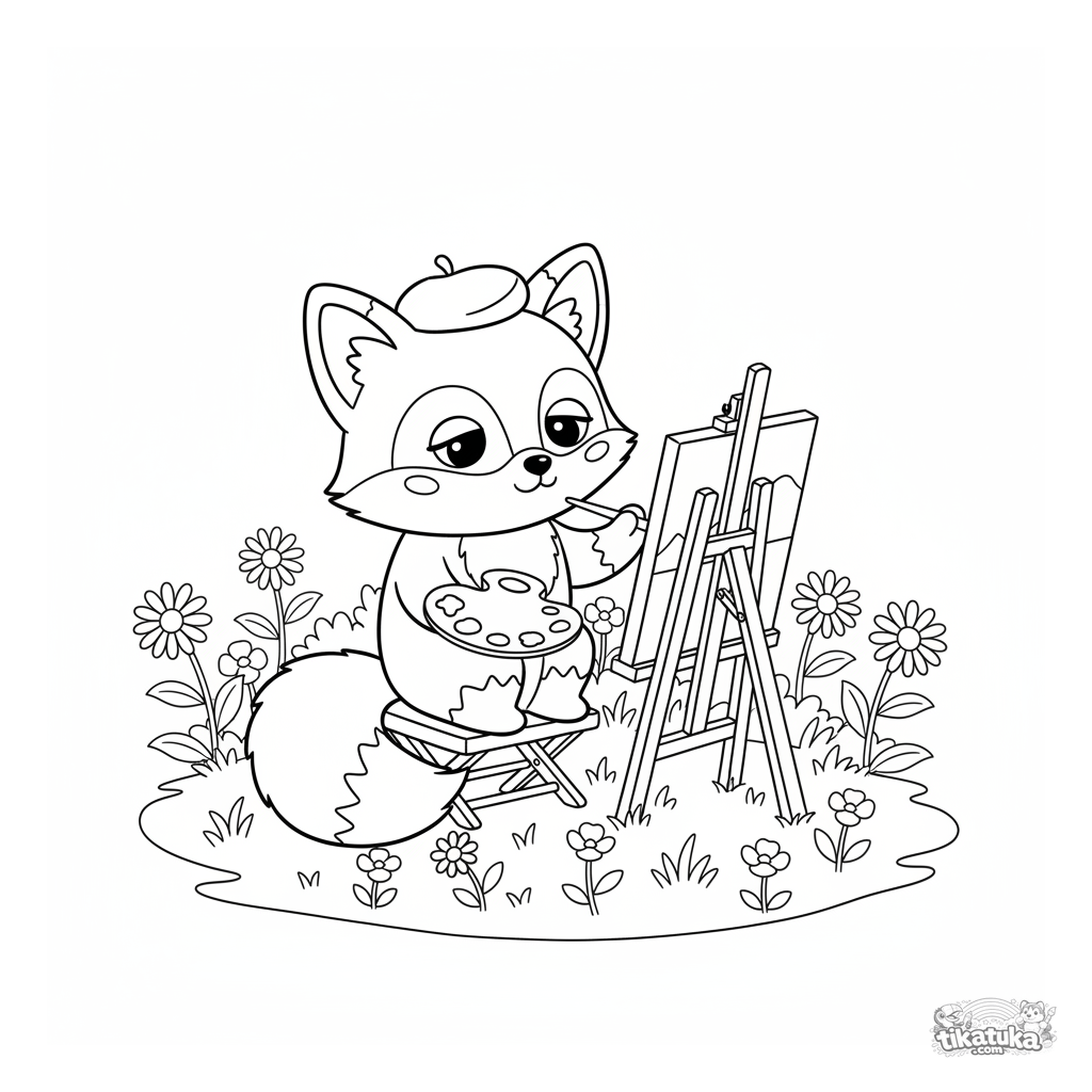 Coloring page for kids 4-6: detective fox Foxy painting a picture of wildflowers at an easel. Cute plush mascot style, peaceful scene, wide margins for creativity.