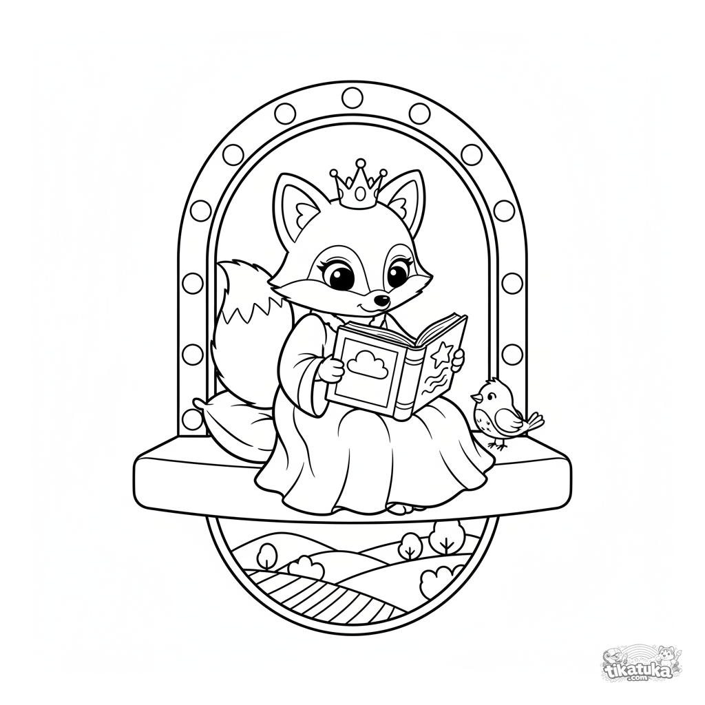 Coloring page for girls: fox princess Foxy reading a book in a castle tower. Soft puppet style, cozy scene, wide clean margins for creativity.