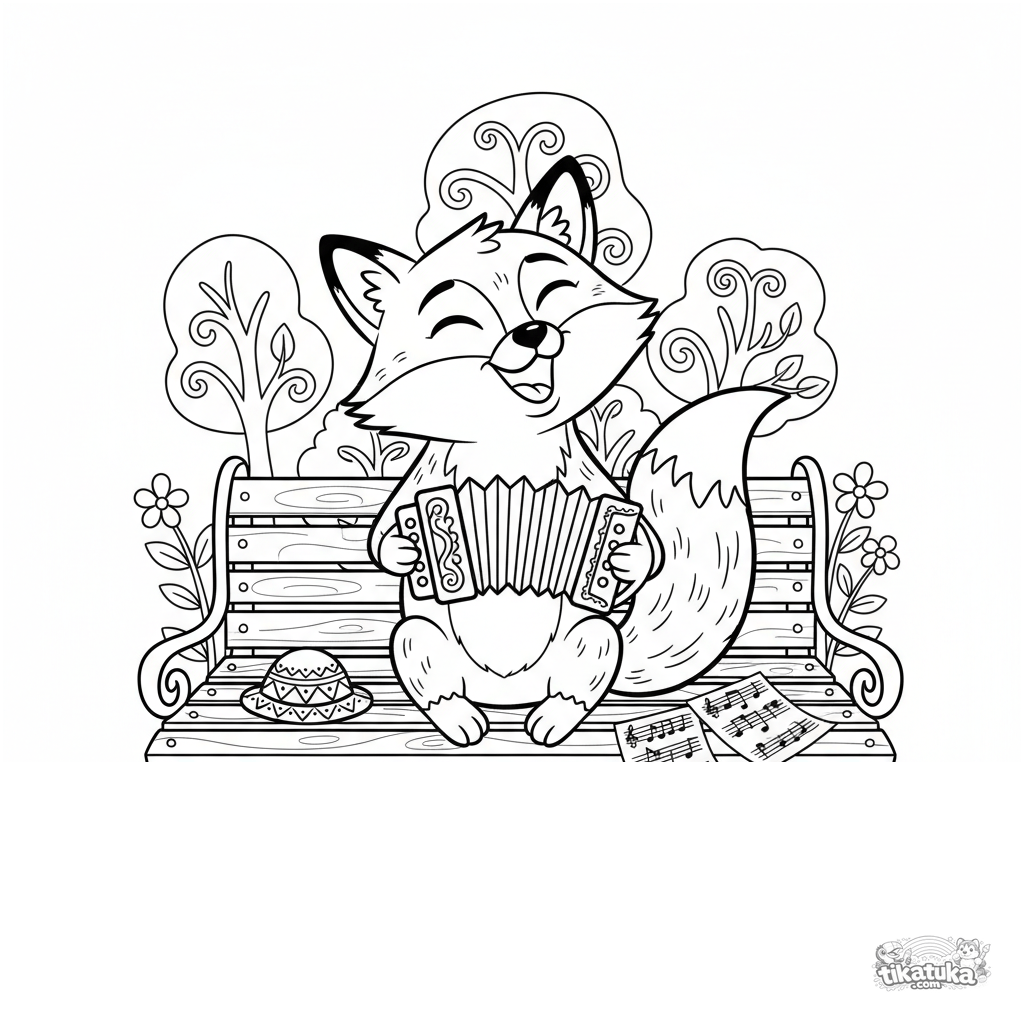 Coloring page for older kids 10-12: a fox in a folk style plays an accordion while sitting on a park bench. A bright, detailed musical scene.