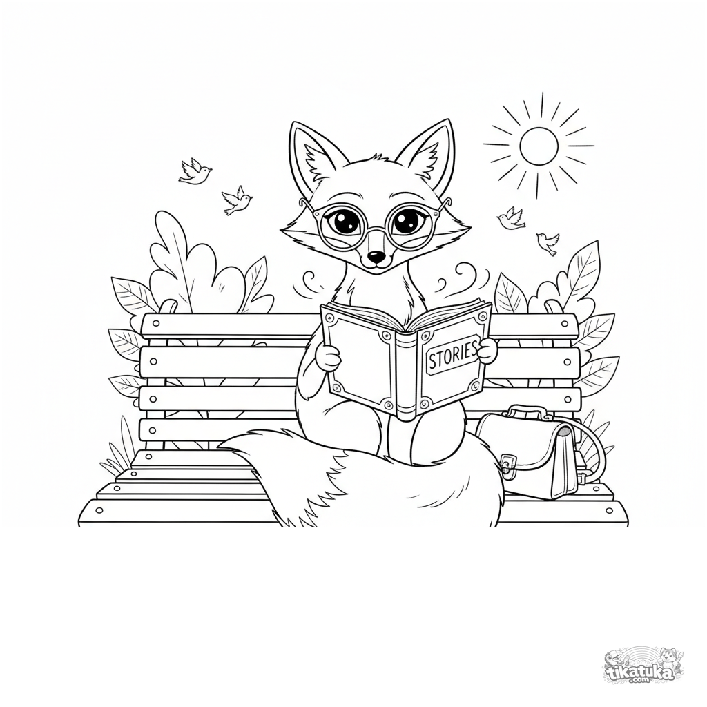 Coloring page for tweens 7-9: a fox reading a book on a park bench. Realistic watercolor sketch style, peaceful scene, moderate detail.