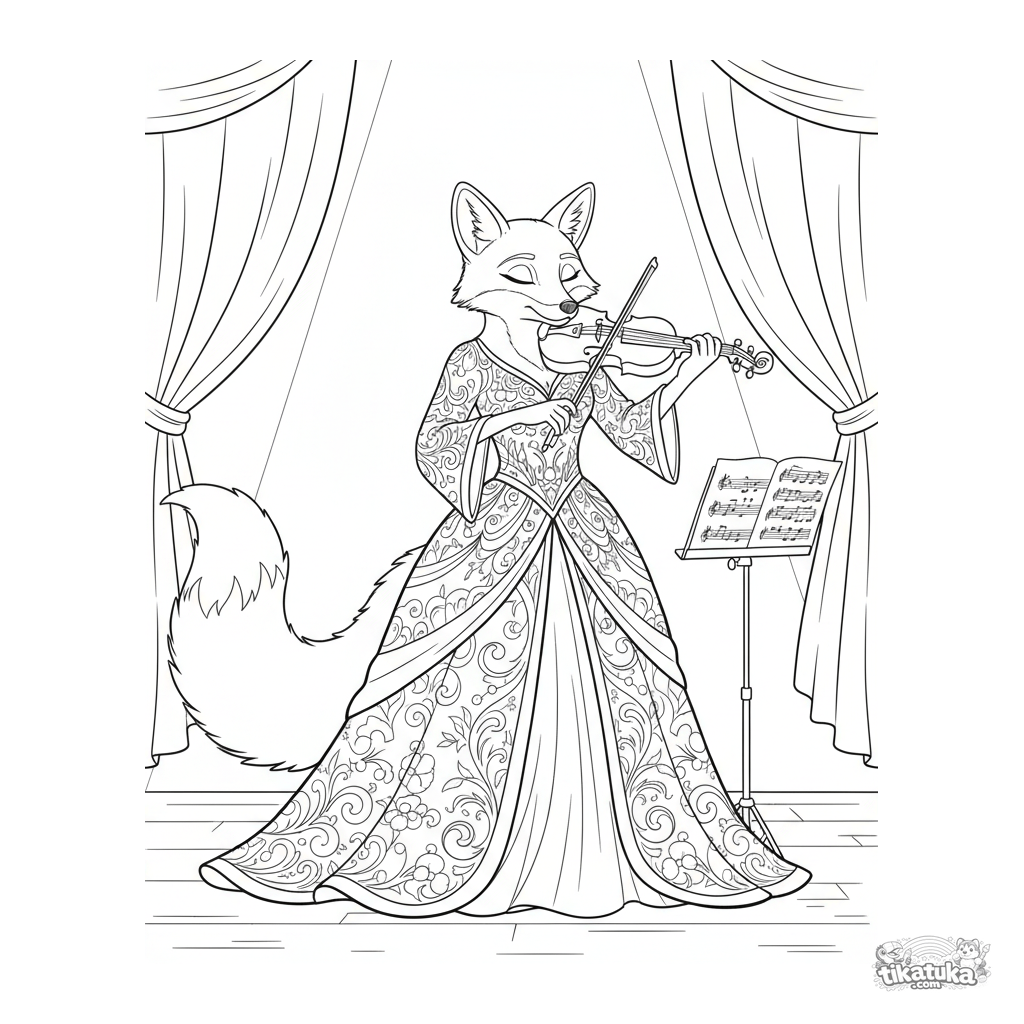 Coloring page for kids 10-12: a fox violinist performing a solo on a grand concert hall stage under a spotlight. Detailed line art.