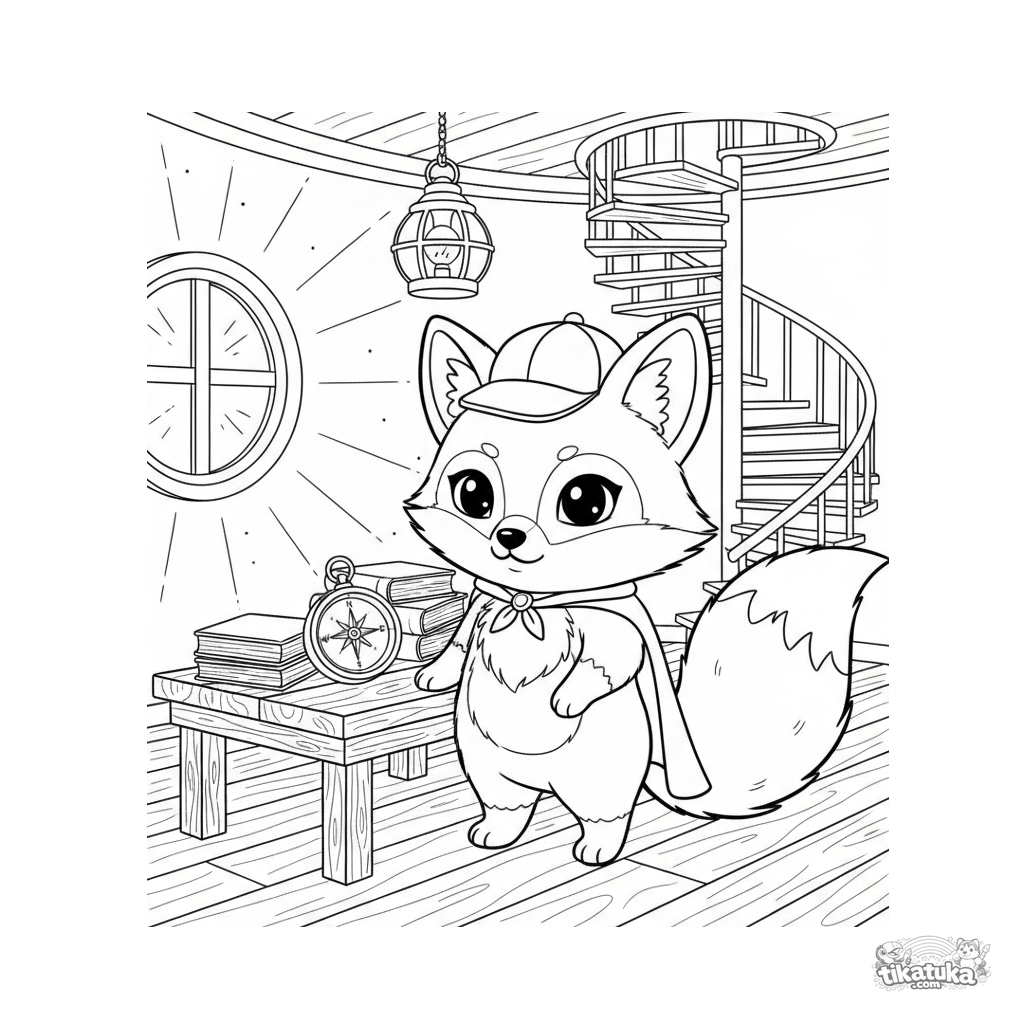 Color Foxy the detective in a mysterious lighthouse room, examining a compass. Download, print, or color online for free!