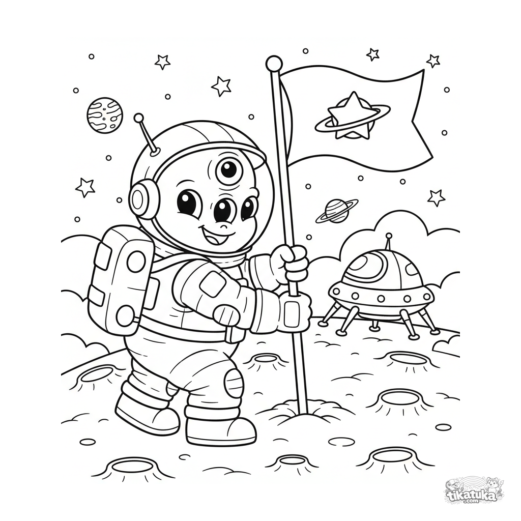 Space coloring page for kids 5-7: a friendly alien in a space suit plants a flag on the moon's surface. Moderate detail and clear shapes.