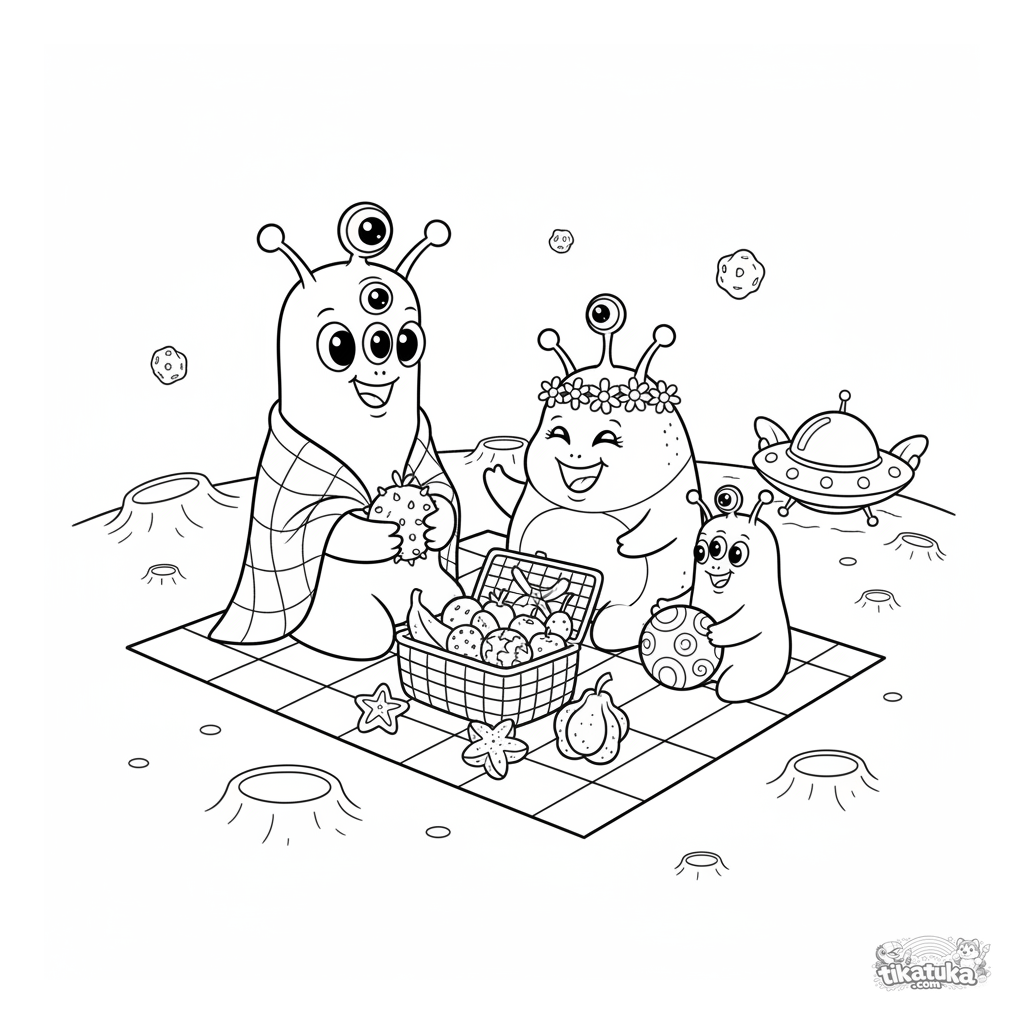 Coloring page for kids 4-6: a friendly alien family has a picnic on the moon's surface. A fun space scene with a flying saucer to color.