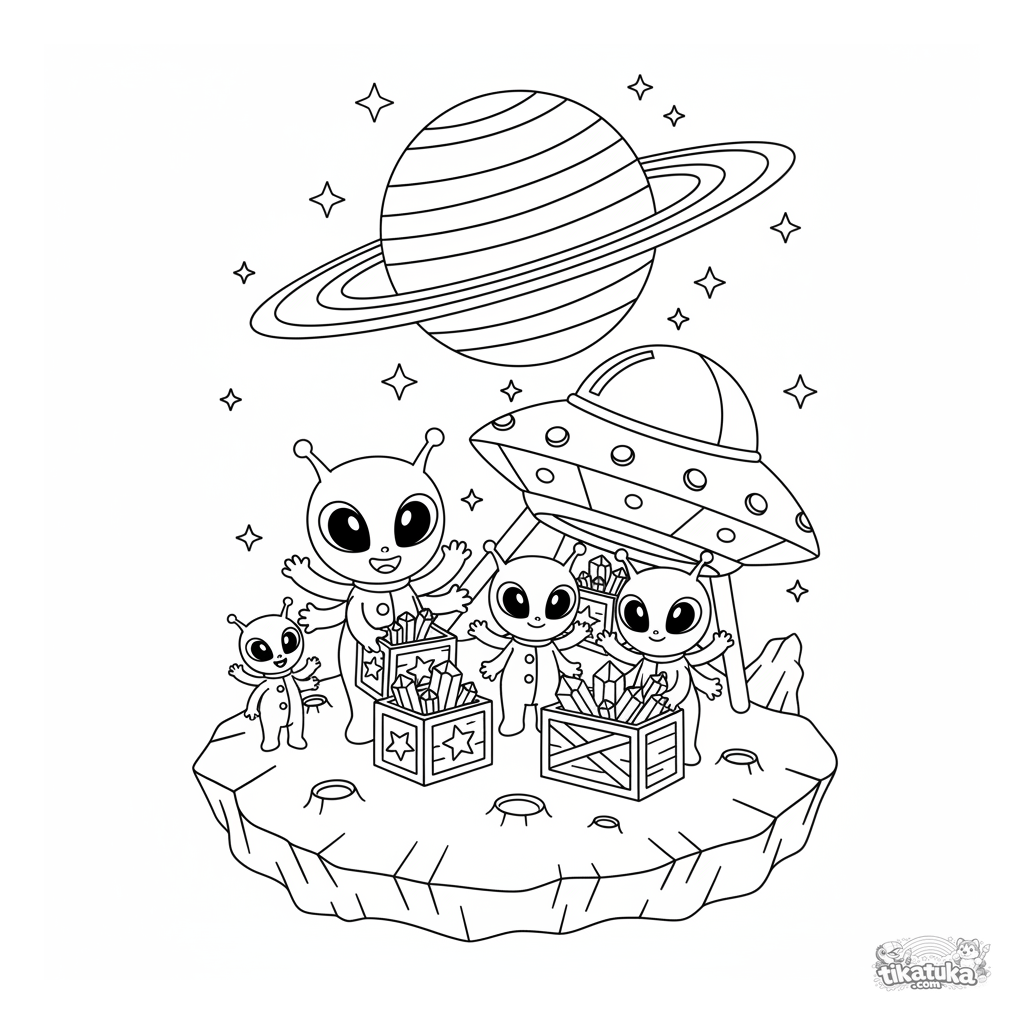 Coloring page for kids 4-6 on a space theme: a family of friendly aliens unloads crystals on an asteroid with a ringed planet in the background. A fantastic scene.