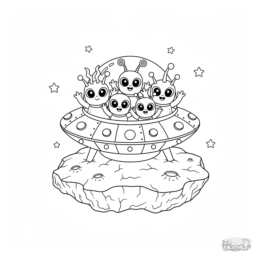 Coloring page for kids 4-6: a friendly family of big-eyed aliens waves from the hatch of their flying saucer, landed on an asteroid.