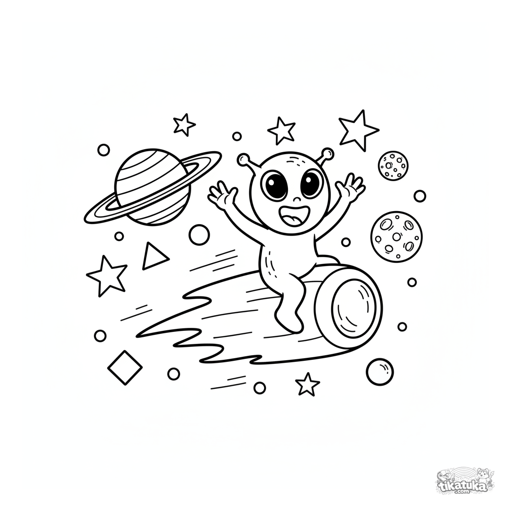 Space coloring page for kids 4-6: a friendly alien rides a comet past a ringed planet. A fun and simple cosmic scene for coloring.