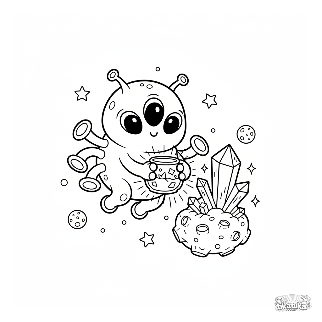 Coloring page for kids 4-6 with a space theme: a friendly alien collects sparkling crystals on an asteroid. A fantastic scene perfect for coloring.