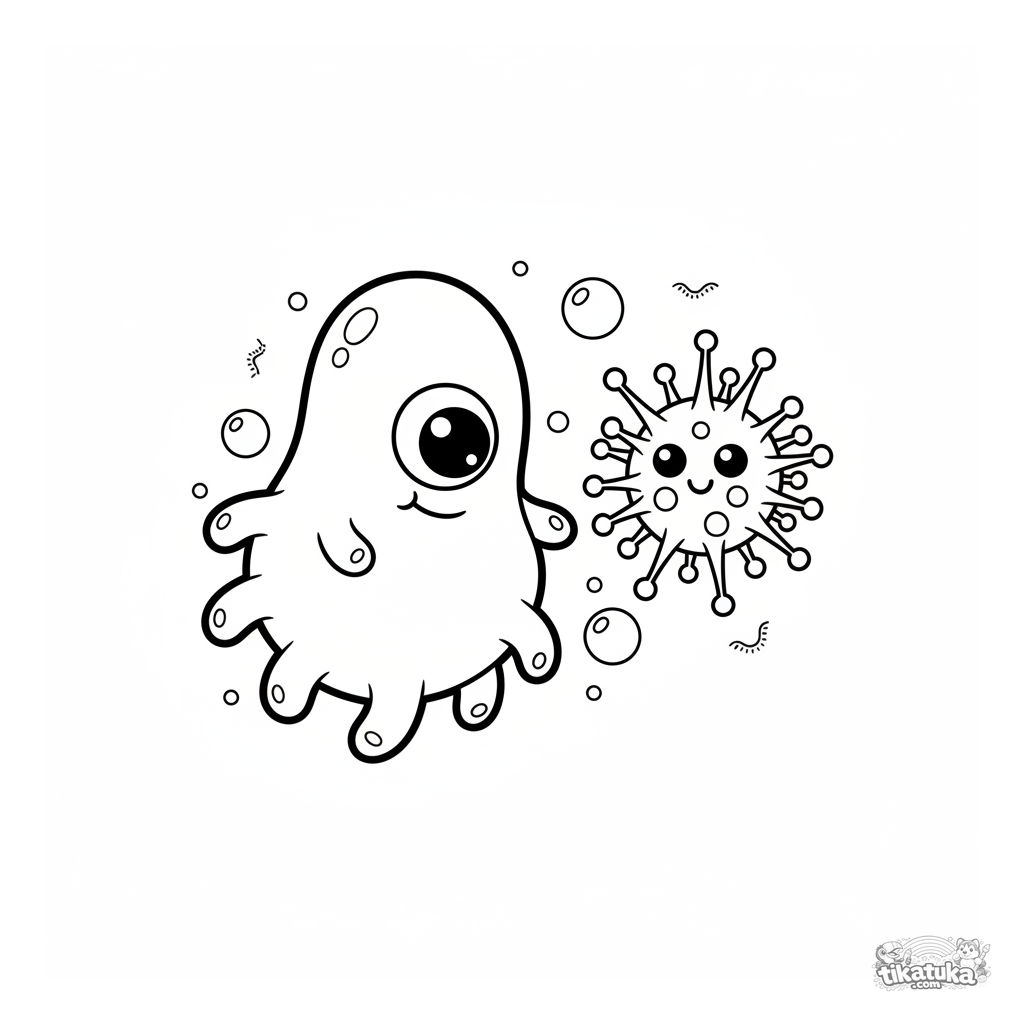 Kids coloring page of a friendly amoeba microbe floating near a cartoon virus. Fun microscopic world for ages 4-6.