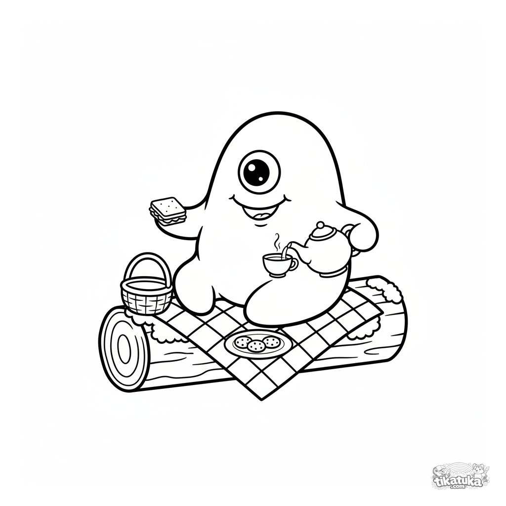 Simple and cute coloring page for toddlers: a friendly amoeba microbe is having a picnic on a mossy log. Large details, thick outlines.
