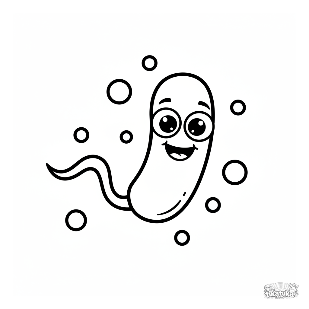 Simple coloring page for toddlers 2-3: a friendly cartoon bacterium with big eyes swims using a flagellum. Large simple shapes, nutrient dots floating around.