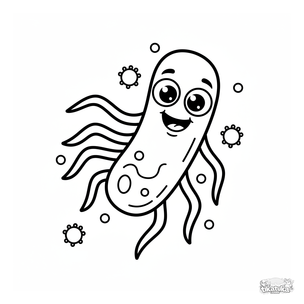 Simple coloring page for toddlers 2-3 years old. A cute, friendly rod-shaped bacterium with googly eyes and flagella swims happily, with nutrient dots floating around.