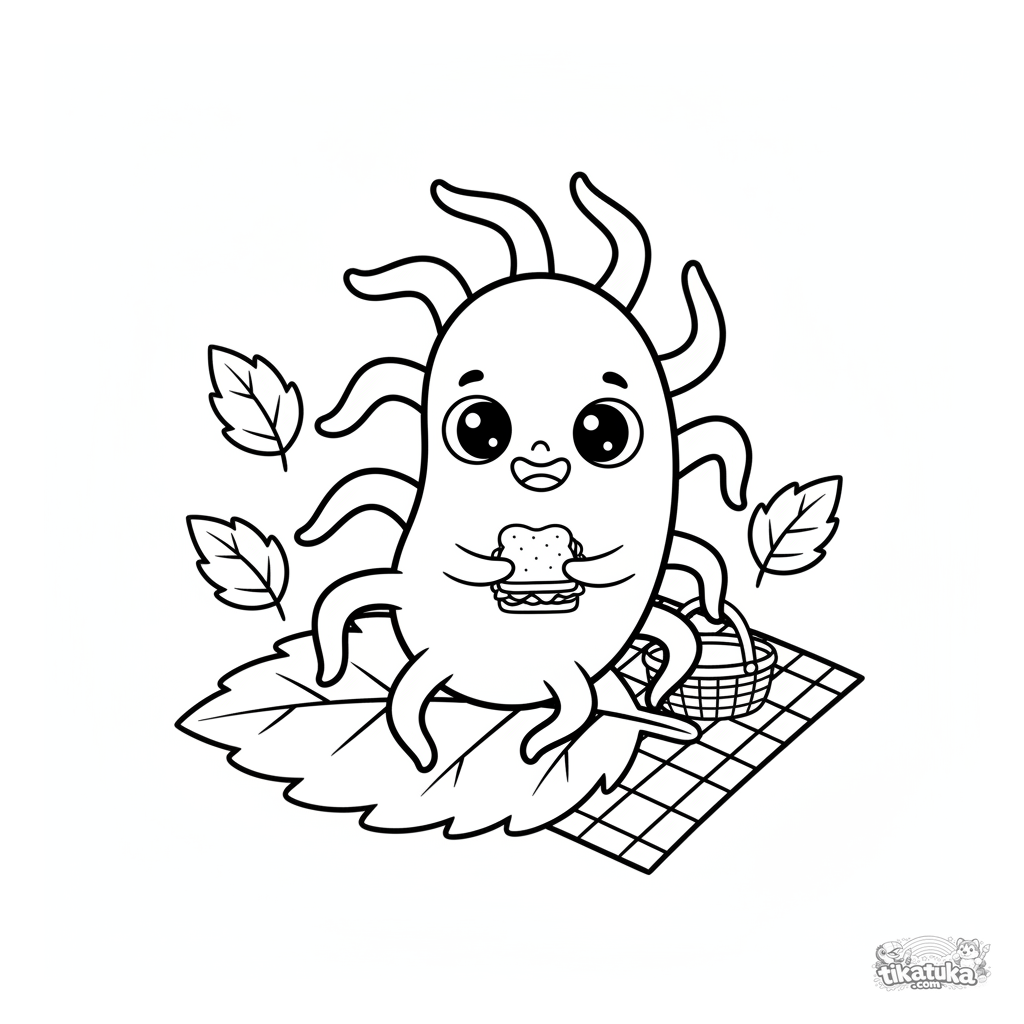 Simple coloring page for toddlers: a friendly bacterium with flagella has a picnic on a leaf. For ages 2-4.
