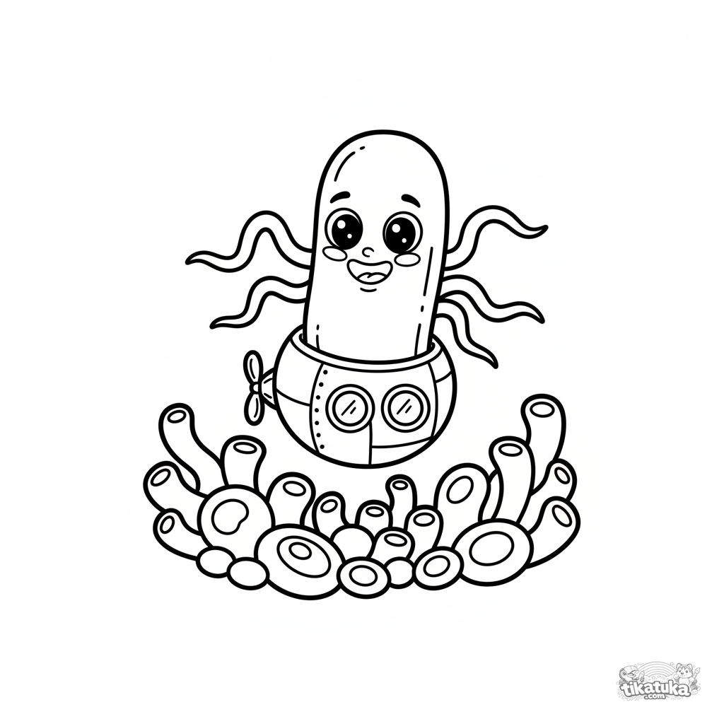 Simple coloring page for toddlers 2-3 years old featuring a friendly bacterium riding a submarine. Large shapes, minimal detail, wide margins.