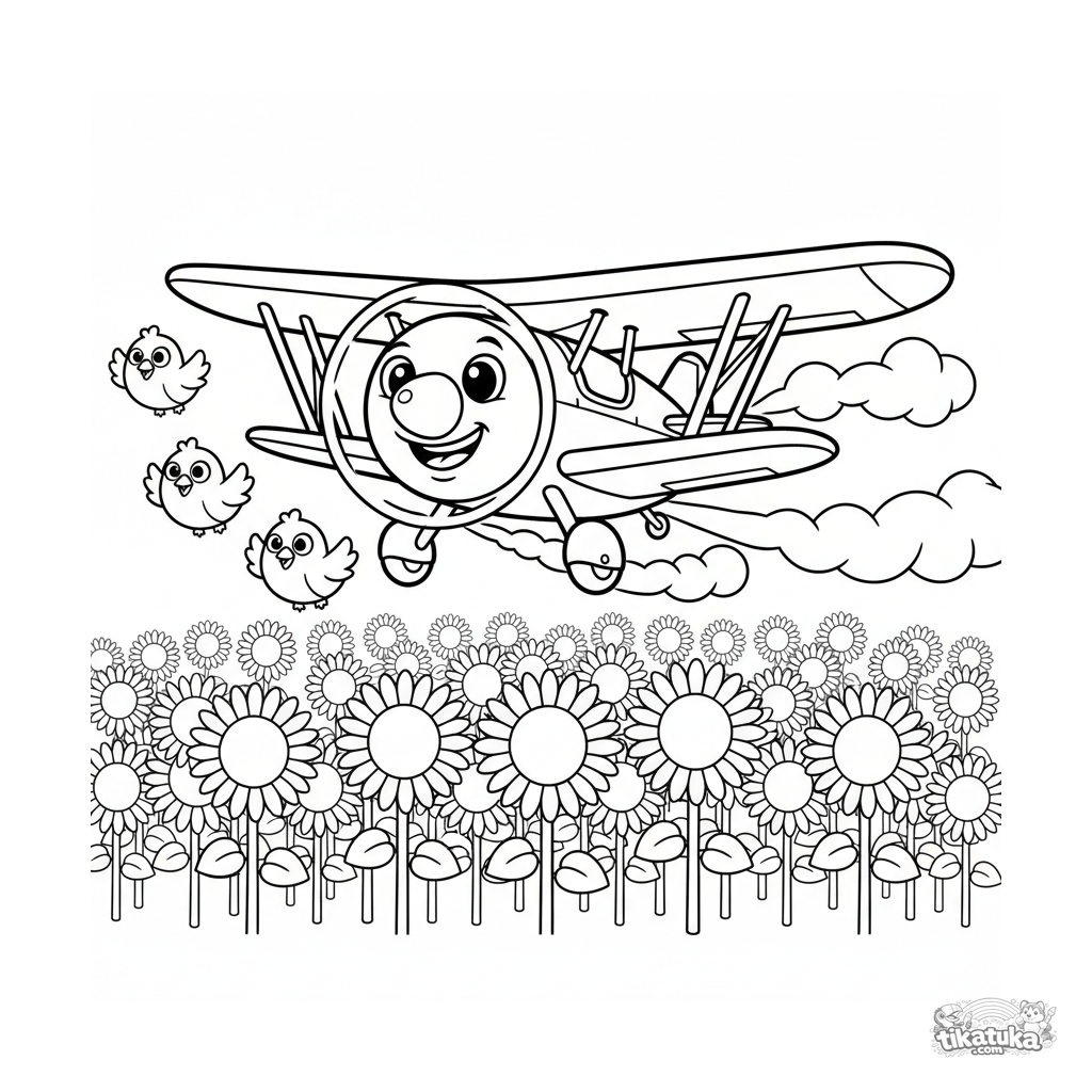 Simple coloring page of a crop duster plane for toddlers 2-3. The plane has a smile on its nose, flying low over sunflowers. Large shapes, thick outlines, plenty of white space.