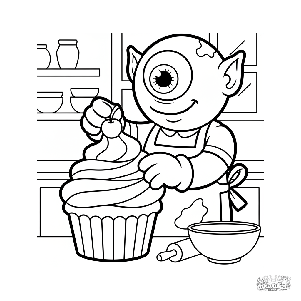 Toddler coloring page 2-3 years: a friendly cyclops baker decorates a giant cupcake. Very simple, large shapes, one main character, almost no background.