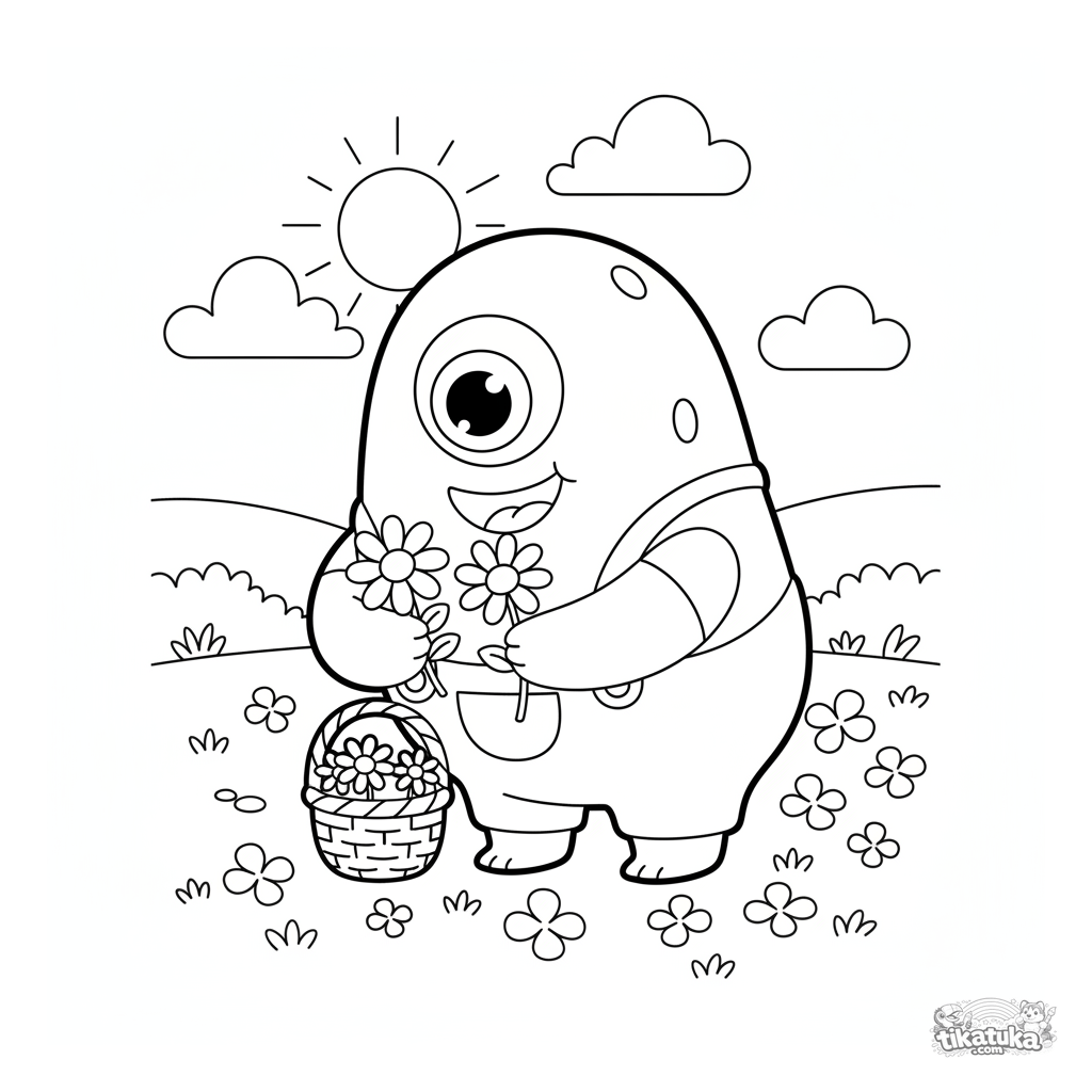 Coloring page of a friendly cyclops monster picking daisies in a meadow. For kids aged 4-6. A simple, cute scene to develop motor skills and creativity.
