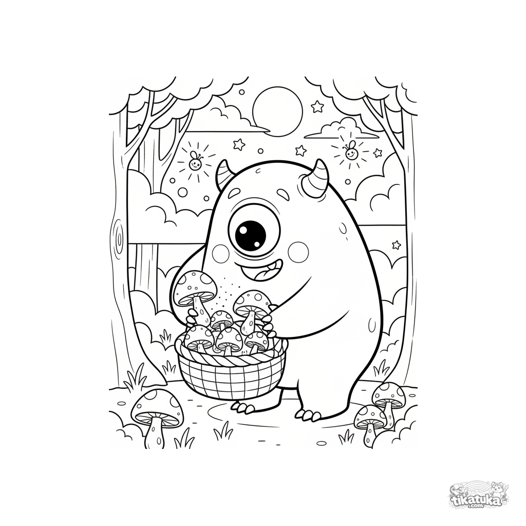 Coloring page for kids: a friendly cyclops picking glowing mushrooms in an enchanted forest. Suitable for ages 4-6, perfect for sparking imagination.