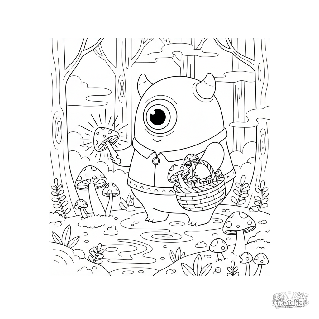 Coloring page of a friendly cyclops in the forest. For kids 4-6. The cute monster is picking glowing mushrooms in a magical forest clearing.