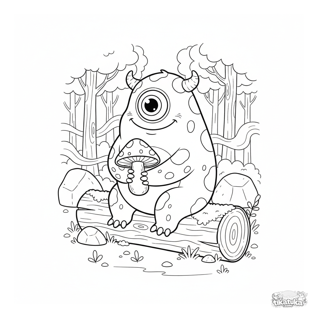 Coloring page of a friendly cyclops monster with spotted fur in a forest. For kids 4-6 years old. The monster sits on a log holding a glowing mushroom, full body visible.