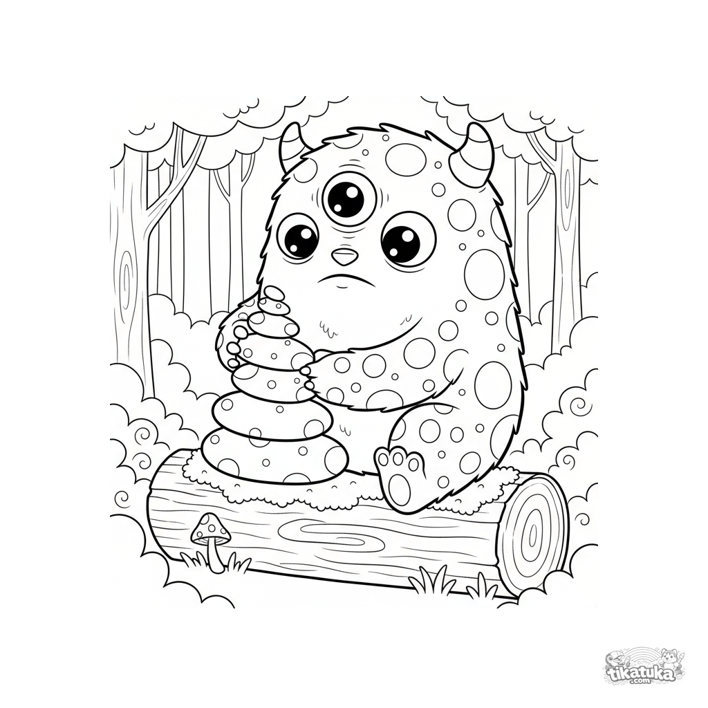 Coloring page of a friendly fuzzy monster in a forest. For kids 4-6 years old. The monster is stacking a pebble tower near a glowing mushroom.