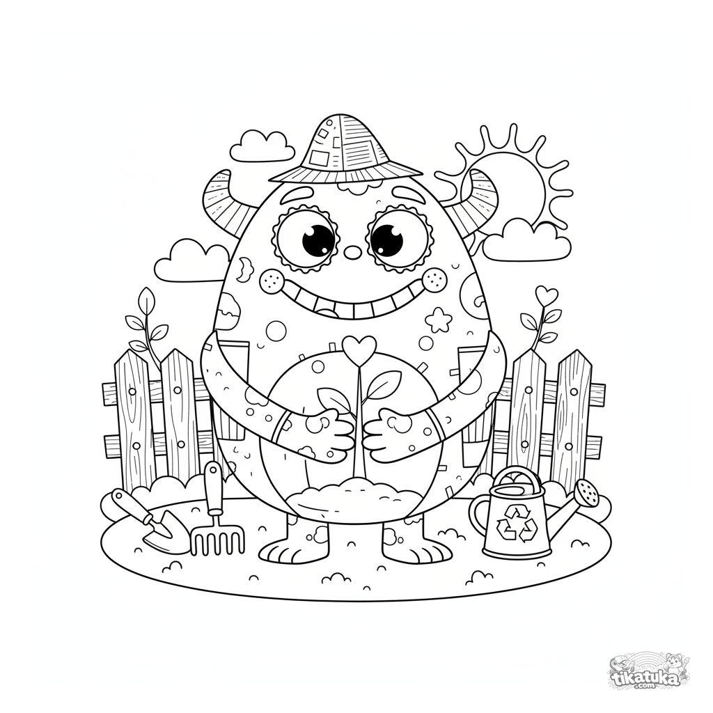 Coloring page of a friendly monster made from recycled materials planting a sapling. For kids 4-6 years old. Theme of ecology and caring for nature.