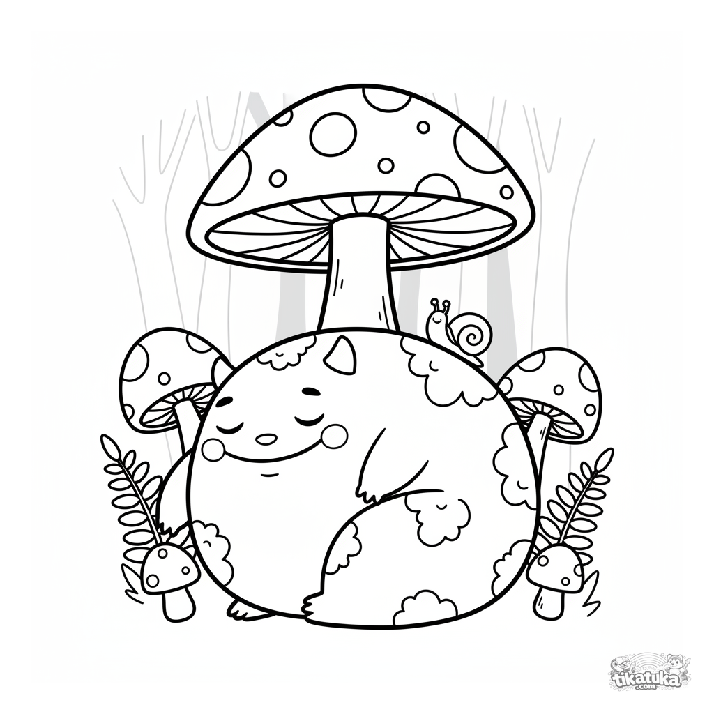 Simple toddler coloring page of a friendly moss monster napping under a giant toadstool. For ages 2-3, featuring very simple, large shapes to color.